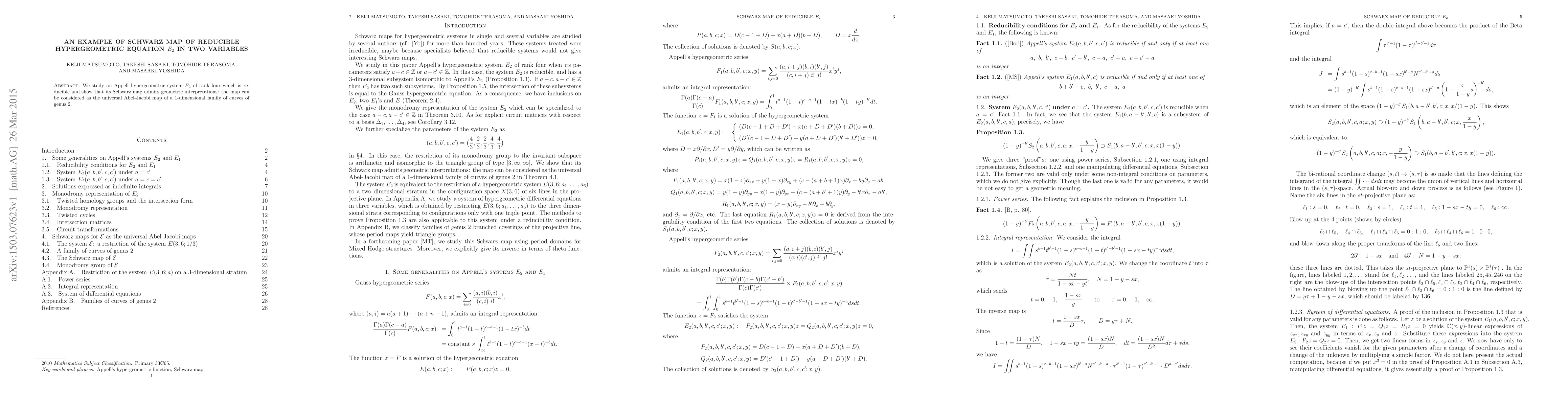 We study an Appell hypergeometric system $E_2$ of rank four which is reducible and show that its Schwarz map admits geometric interpretations: the map can be considered as the universal Abel-Jacobi map of a $1$-dimensional family of curves of genus 2.
