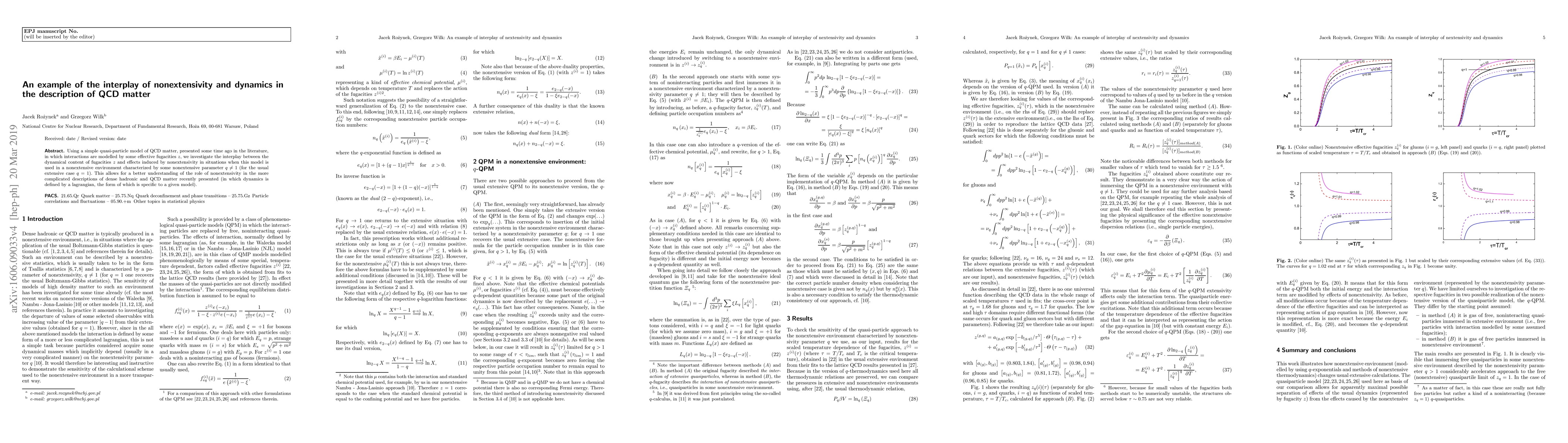 This paper explores the interaction between nonextensivity and dynamics in a quasi-particle model of QCD matter, using effective fugacities z to model interactions. It examines how nonextensivity, characterized by a nonextensive parameter q ≠ 1, influences the dynamics, providing insights into the role of nonextensivity in complex descriptions of dense hadronic and QCD matter.