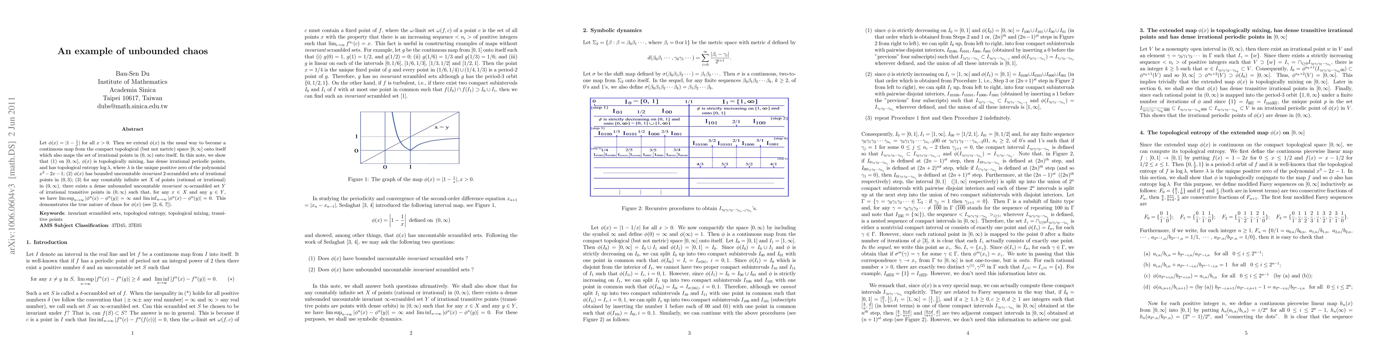 Let $\phi(x) = |1 - \frac 1x|$ for all $x > 0$. Then we extend $\phi(x)$ in the usual way to become a continuous map from the compact topological (but not metric) space $[0, \infty]$ onto itself which also maps the set of irrational points in $(0, \infty)$ onto itself. In this note, we show that (1) on $[0, \infty]$, $\phi(x)$ is topologically mixing, has dense irrational periodic points, and has topological entropy $\log \lambda$, where $\lambda$ is the unique positive zero of the polynomial $x^3 - 2x -1$; (2) $\phi(x)$ has bounded uncountable {\it invariant} 2-scrambled sets of irrational points in $(0, 3)$; (3) for any countably infinite set $X$ of points (rational or irrational) in $(0, \infty)$, there exists a dense unbounded uncountable {\it invariant} $\infty$-scrambled set $Y$ of irrational transitive points in $(0, \infty)$ such that, for any $x \in X$ and any $y \in Y$, we have $\limsup_{n \to \infty} |\phi^n(x) - \phi^n(y)| = \infty$ and $\liminf_{n \to \infty} |\phi^n(x) - \phi^n(y)| = 0$. This demonstrates the true nature of chaos for $\phi(x)$.