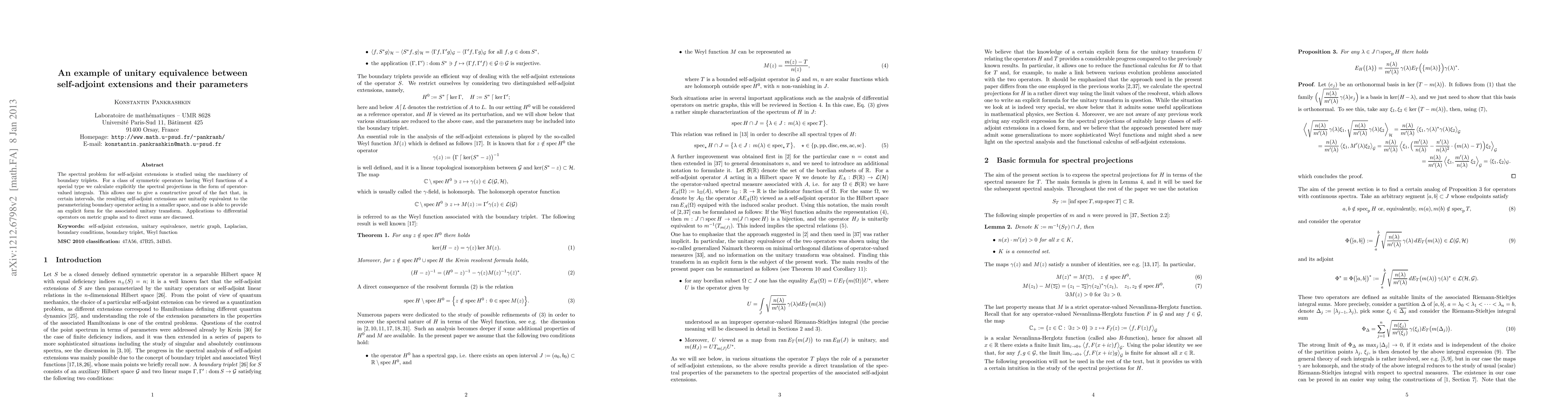 This paper explores the unitary equivalence between self-adjoint extensions and their parameters using boundary triplets. It provides a constructive proof showing that certain self-adjoint extensions are unitarily equivalent to a parameterizing operator, with explicit forms for the unitary transform, and discusses applications to differential operators and direct sums.