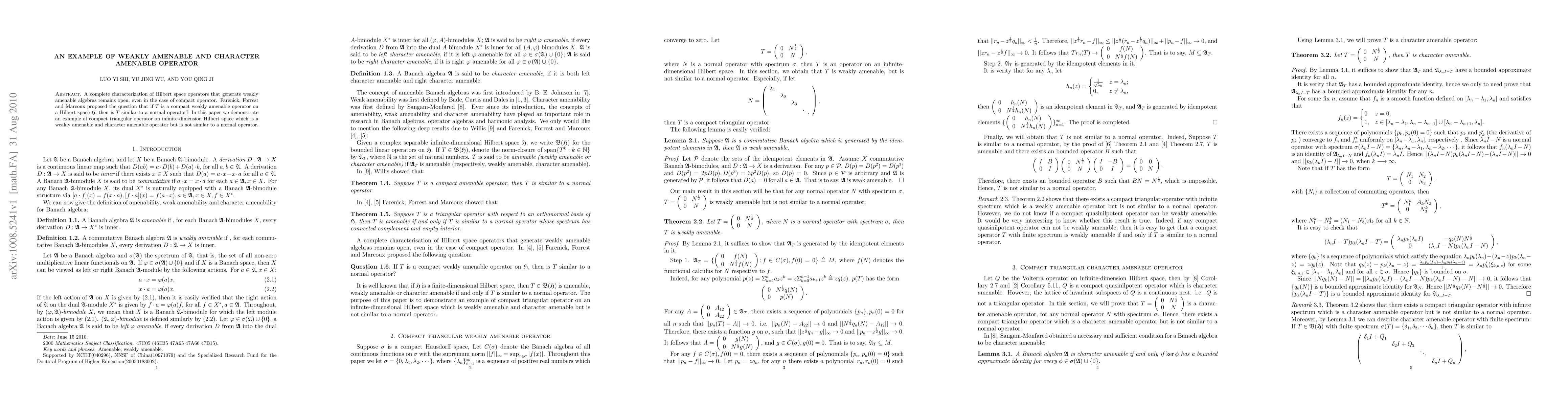 This paper presents a compact triangular operator on an infinite-dimensional Hilbert space that exemplifies a weakly amenable and character amenable operator, while also showing that it is not similar to a normal operator, addressing an open question in operator theory.