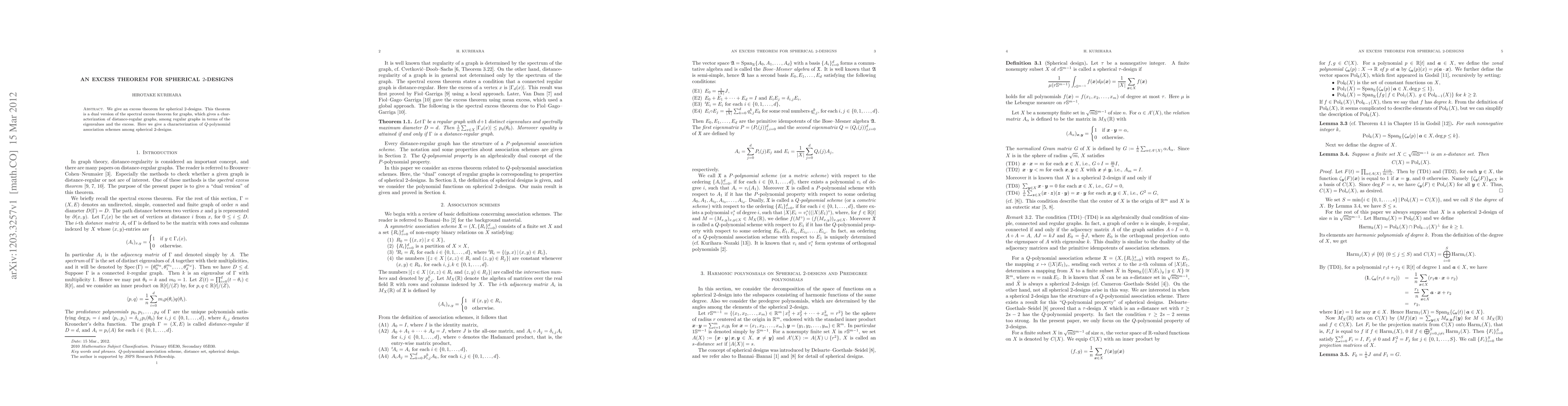 We give an excess theorem for spherical 2-designs. This theorem is a dual version of the spectral excess theorem for graphs, which gives a characterization of distance-regular graphs, among regular graphs in terms of the eigenvalues and the excess. Here we give a characterization of Q-polynomial association schemes among spherical 2-designs.