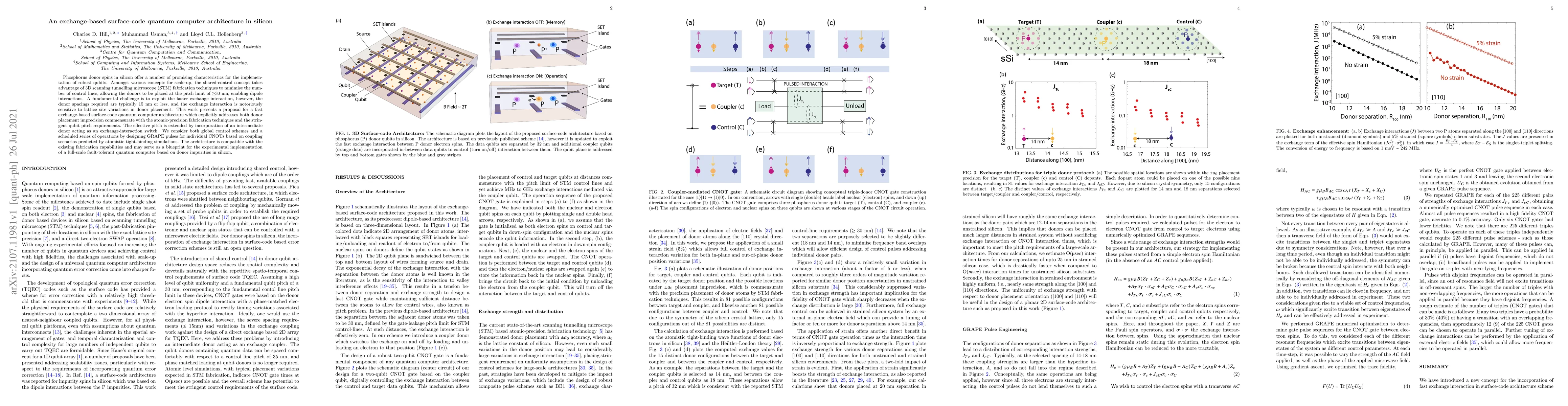 This paper proposes a scalable silicon-based quantum computer architecture using phosphorus donor spins, leveraging 3D STM fabrication to minimize control lines. The design addresses placement precision and qubit pitch challenges by introducing an intermediate donor to enhance exchange interactions, enabling a fault-tolerant quantum computer.