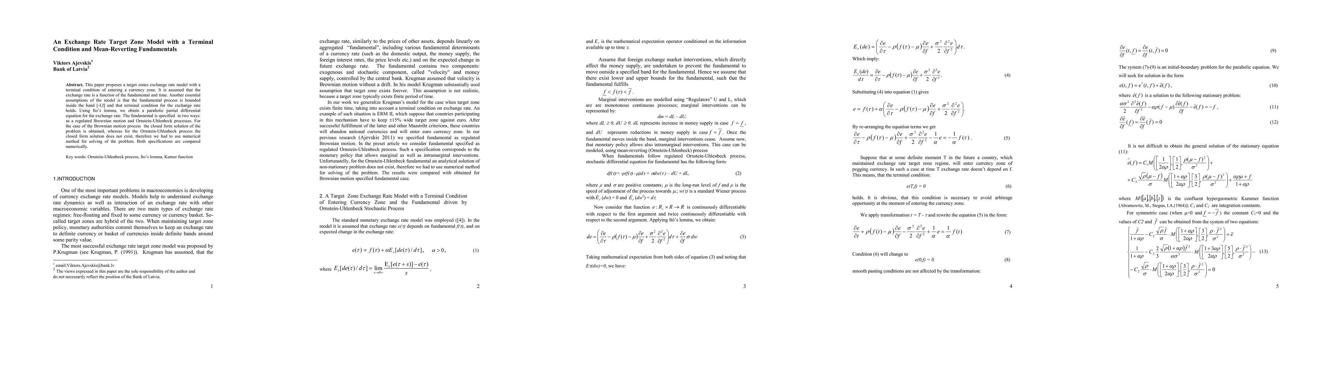 This paper introduces a target zones exchange rate model with a terminal condition for currency zone entry, where the exchange rate is influenced by time-dependent fundamentals. The model specifies fundamentals as either regulated Brownian motion or Ornstein-Uhlenbeck processes, with a closed form solution for the former and numerical methods for the latter. Both specifications are numerically compared.