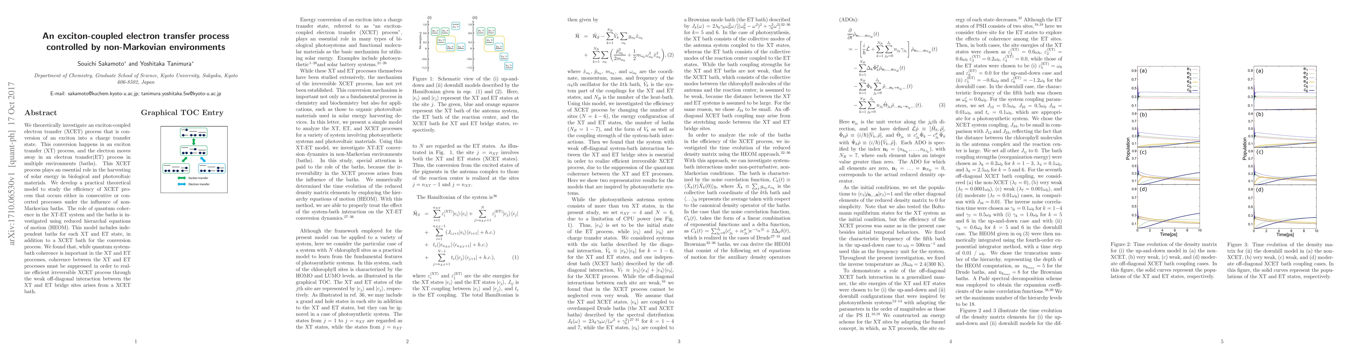 We theoretically investigate an exciton-coupled electron transfer (XCET) process that is conversion of an exciton into a charge transfer state. This conversion happens in an exciton transfer (XT) process, and the electron moves away in an electron transfer(ET) process in multiple environments (baths). This XCET process plays an essential role in the harvesting of solar energy in biological and photovoltaic materials. We develop a practical theoretical model to study the efficiency of XCET process that occurs either in consecutive or concerted processes under the influence of non-Markovian baths. The role of quantum coherence in the XT-ET system and the baths is investigated using reduced hierarchal equations of motion (HEOM). This model includes independent baths for each XT and ET state, in addition to a XCET bath for the conversion process. We found that, while quantum system-bath coherence is important in the XT and ET processes, coherence between the XT and ET processes must be suppressed in order to realize efficient irreversible XCET process through the weak off-diagonal interaction between the XT and ET bridge sites arises from a XCET bath.