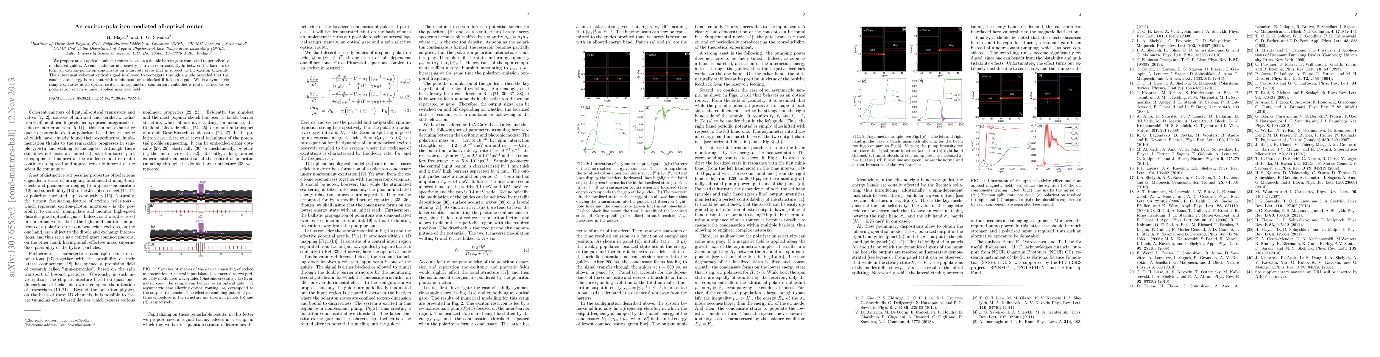We propose an all-optical nonlinear router based on a double barrier gate connected to periodically modulated guides. A semiconductor microcavity is driven nonresonantly in-between the barriers to form an exciton-polariton condensate on a discrete state that is subject to the exciton blueshift. The subsequent coherent optical signal is allowed to propagate through a guide provided that the condensate energy is resonant with a miniband or is blocked if it faces a gap. While a symmetric sample operates as an optical switch, its asymmetric counterpart embodies a router turned to be polarization selective under applied magnetic field.