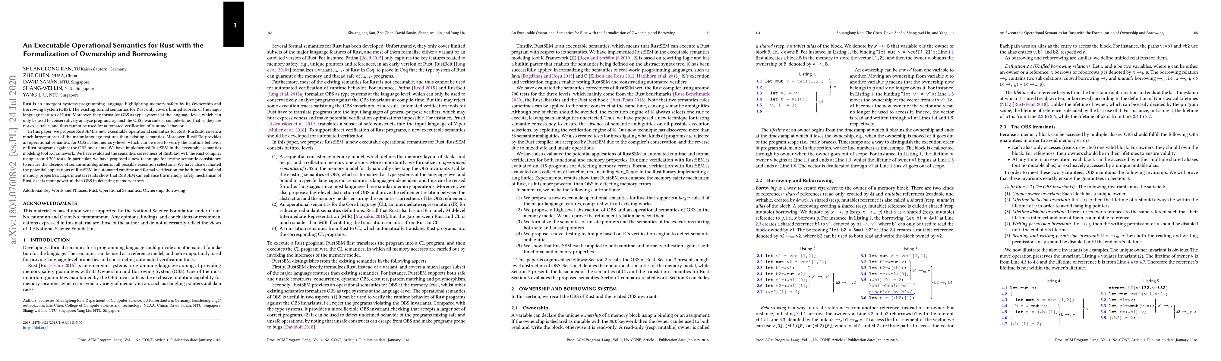 This paper introduces RustSEM, an executable operational semantics for Rust that comprehensively covers major language features, including a detailed operational semantics for Rust's Ownership and Borrowing System (OBS) at the memory-level. The authors implemented RustSEM in the K-Framework and validated its correctness through extensive testing, demonstrating its potential for automated runtime and formal verification to enhance Rust's memory safety.