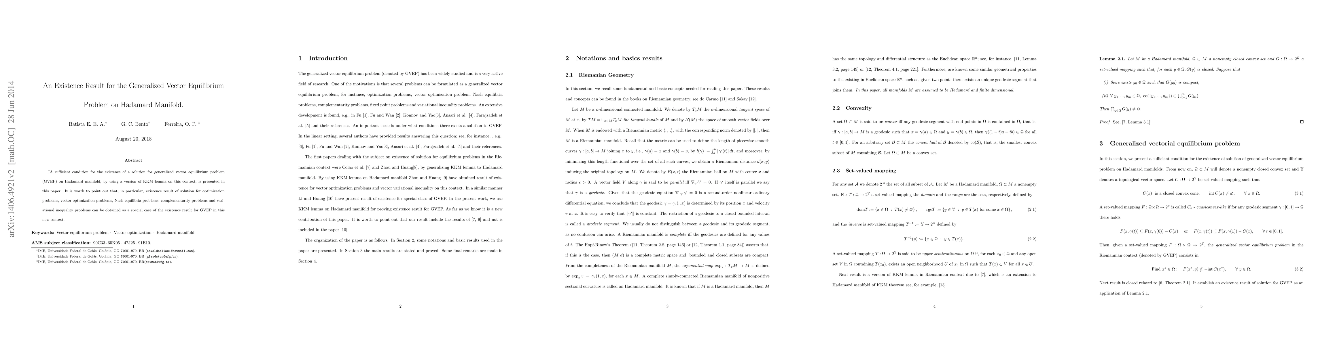 This paper establishes a sufficient condition for the existence of solutions for the generalized vector equilibrium problem (GVEP) on Hadamard manifolds, leveraging a KKM lemma adaptation. The findings also extend to various special cases including optimization, vector optimization, Nash equilibria, complementarity, and variational inequality problems.