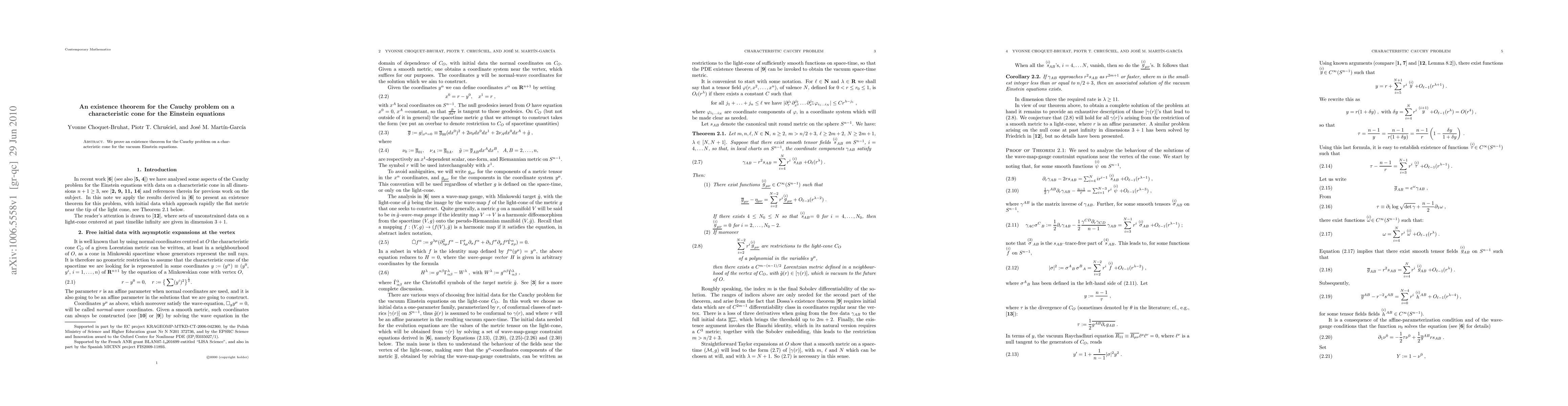 Summary: This paper establishes an existence theorem for the Cauchy problem on a characteristic cone for the vacuum Einstein equations, providing a foundational result for understanding the initial value formulation of these equations.