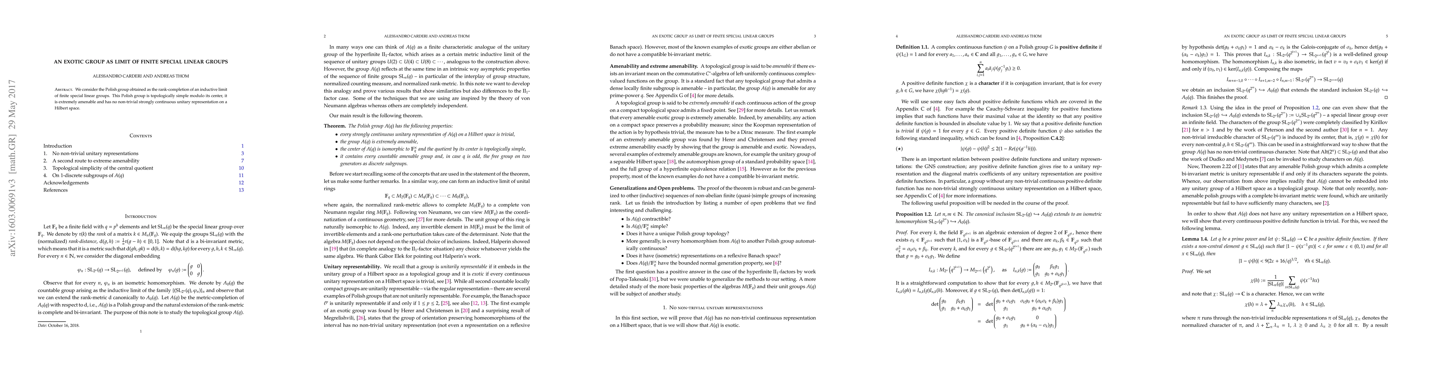 Researchers studied a group formed from an inductive limit of finite special linear groups, finding it to be extremely amenable and having no non-trivial strongly continuous unitary representation on a Hilbert space.