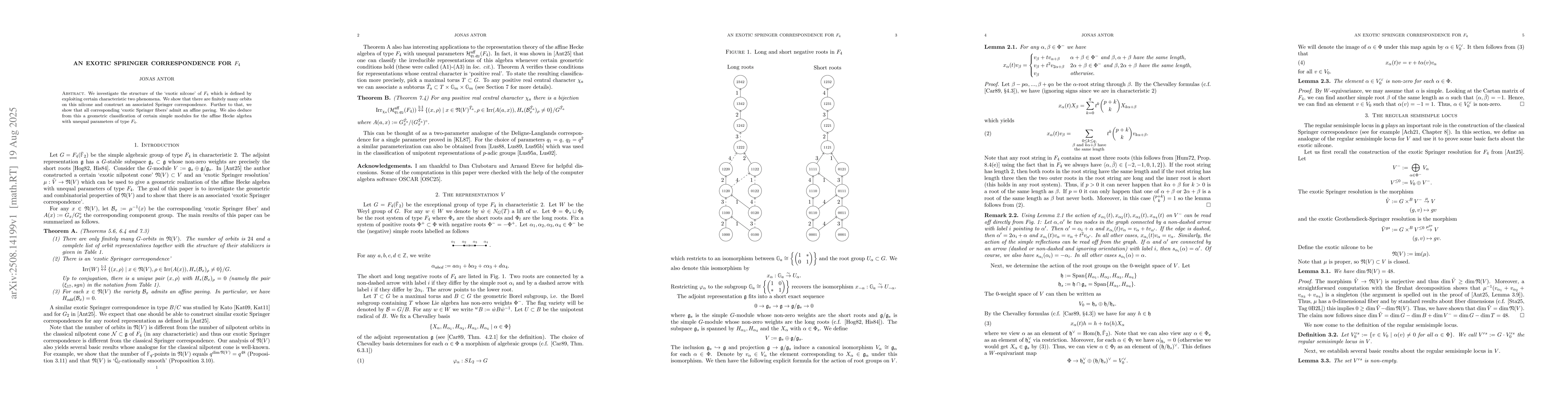 We investigate the structure of the `exotic nilcone' of $F_4$ which is defined by exploiting certain characteristic two phenomena. We show that there are finitely many orbits on this nilcone and construct an associated Springer correspondence. Further to that, we show that all corresponding `exotic Springer fibers' admit an affine paving. We also deduce from this a geometric classification of certain simple modules for the affine Hecke algebra with unequal parameters of type $F_4$.