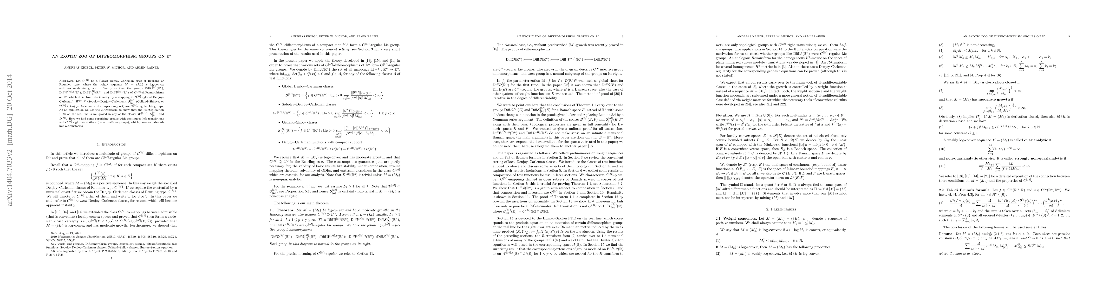 This paper proves that various groups of diffeomorphisms on $\mathbb{R}^n$ are $C^{[M]}$-regular Lie groups, including those differing from the identity by mappings in global, Sobolev, Gelfand-Shilov, and Denjoy-Carleman classes. It also demonstrates the well-posedness of the Hunter-Saxton PDE in several classes using the $R$-transform.