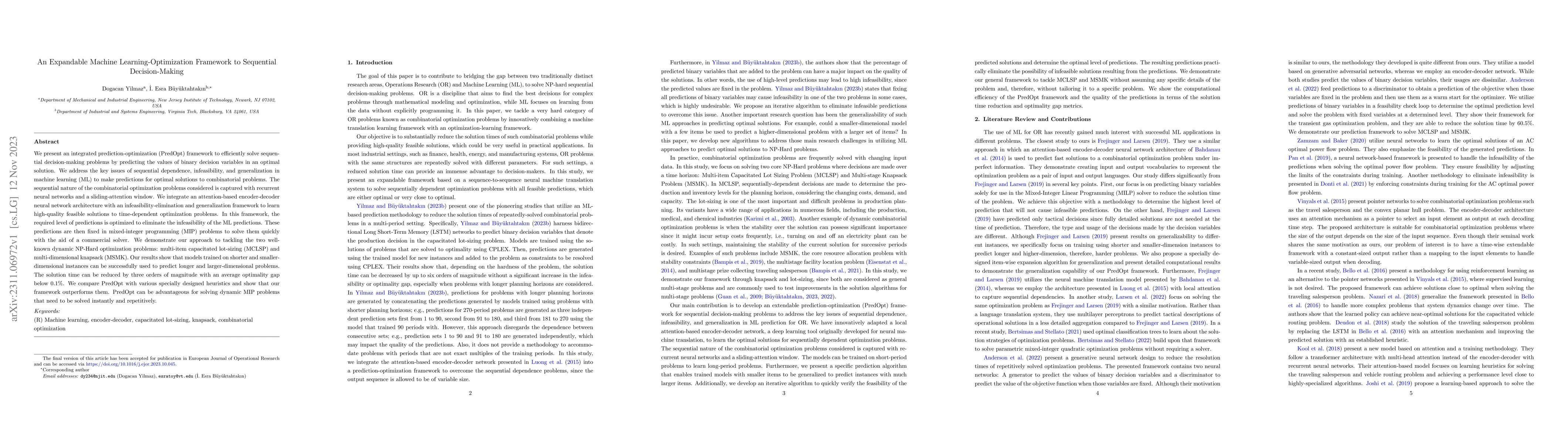 This paper introduces a PredOpt framework combining machine learning and optimization to solve sequential decision-making problems efficiently. It leverages recurrent neural networks and attention mechanisms to predict optimal solutions for combinatorial problems, significantly reducing solution times and achieving near-optimal results.