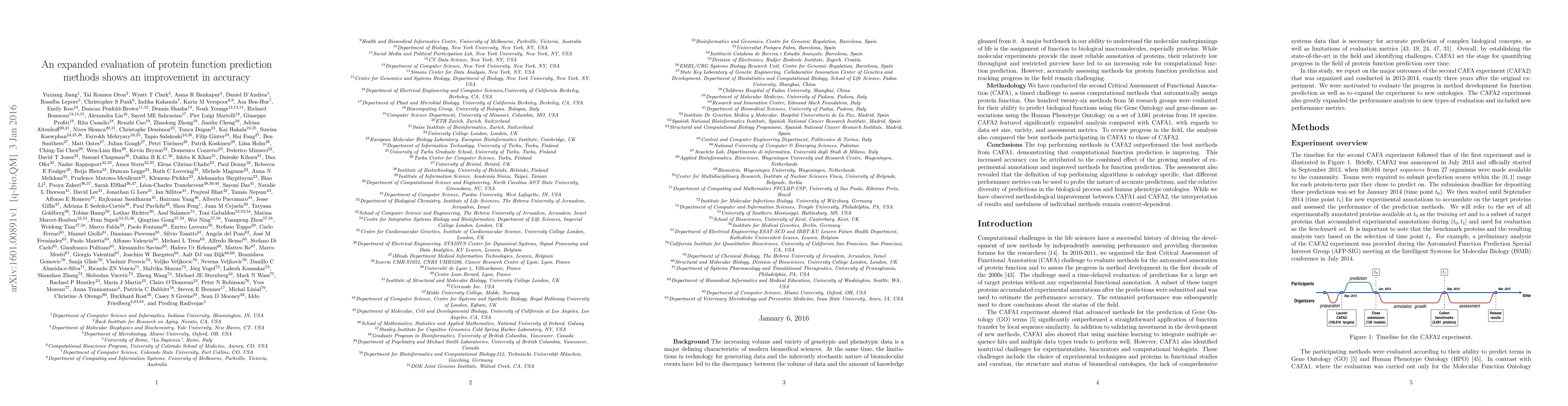 A recent study evaluates 126 protein function prediction methods on a large dataset of 3,681 proteins from 18 species, showing significant improvement in accuracy compared to previous evaluations. The results demonstrate that computational function prediction is becoming more accurate due to growing experimental annotations and improved prediction methods.