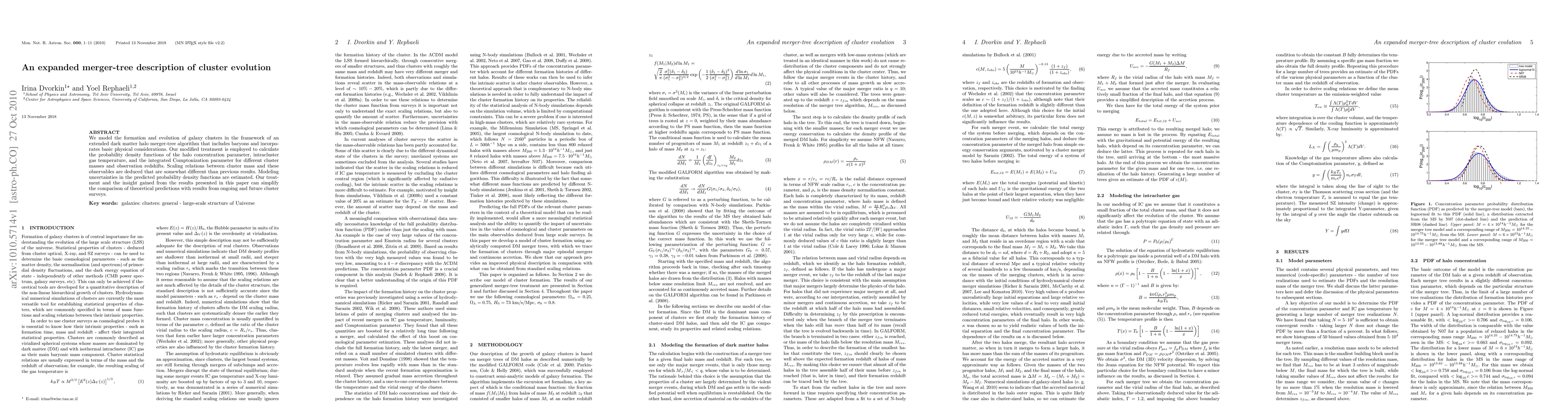 We model the formation and evolution of galaxy clusters in the framework of an extended dark matter halo merger-tree algorithm that includes baryons and incorporates basic physical considerations. Our modified treatment is employed to calculate the probability density functions of the halo concentration parameter, intracluster gas temperature, and the integrated Comptonization parameter for different cluster masses and observation redshifts. Scaling relations between cluster mass and these observables are deduced that are somewhat different than previous results. Modeling uncertainties in the predicted probability density functions are estimated. Our treatment and the insight gained from the results presented in this paper can simplify the comparison of theoretical predictions with results from ongoing and future cluster surveys.