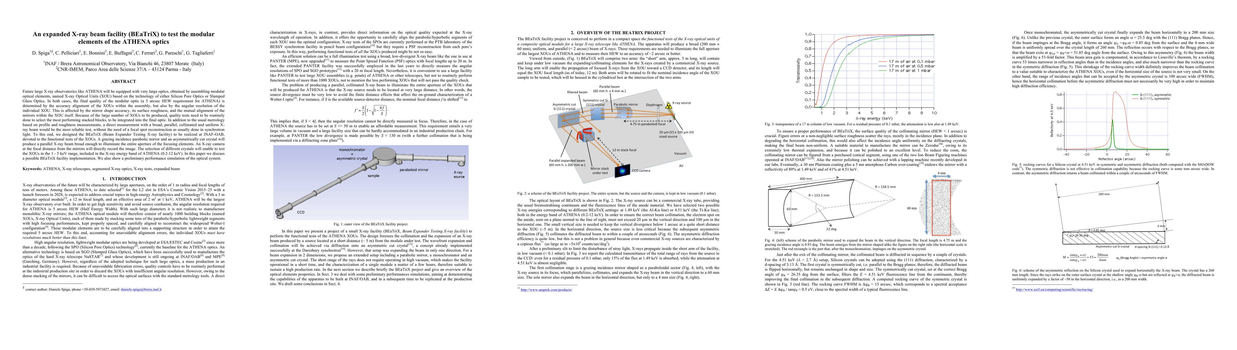 The paper discusses the design of BEaTriX, an X-ray beam facility to test modular elements of the ATHENA observatory's optics, focusing on alignment accuracy and angular resolution. The facility uses a grazing incidence parabolic mirror and a crystal to produce a broad, uniform X-ray beam for direct imaging tests in the 1-5 keV range.