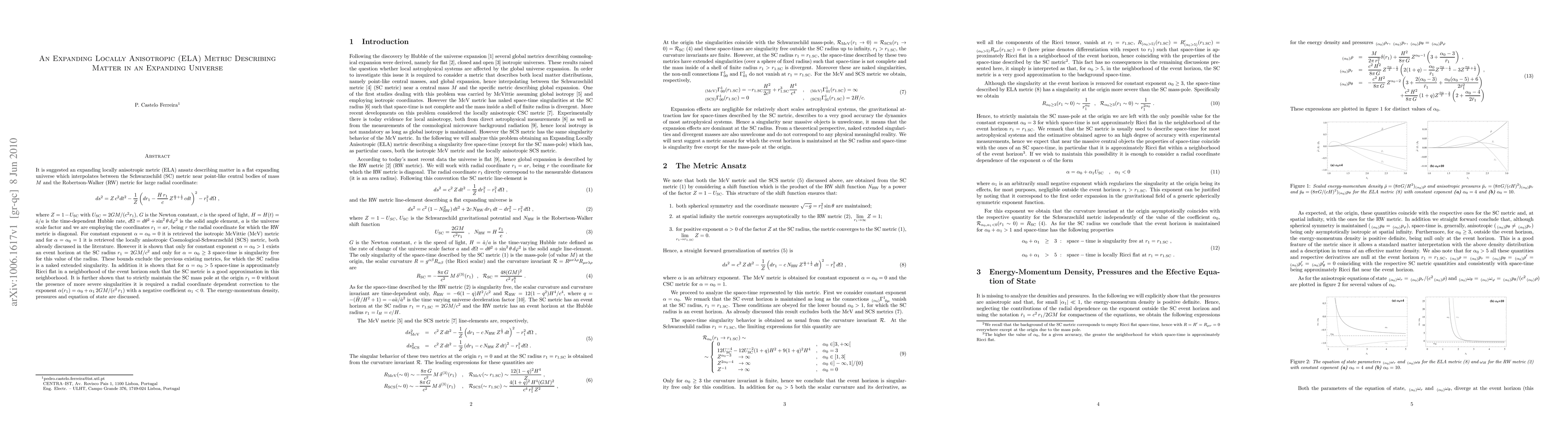 It is suggested an expanding locally anisotropic metric (ELA) ansatz describing matter in a flat expanding universe which interpolates between the Schwarzschild (SC) metric near point-like central bodies of mass 'M' and the Robertson-Walker (RW) metric for large radial coordinate: 'ds^2=Z(cdt)2 - 1/Z (dr1-(Hr1/c) Z^(alpha/2+1/2)(cdt))^2-r1^2 dOmega', where 'Z=1-U' with 'U=2GM/(c^2r1)', 'G' is the Newton constant, 'c' is the speed of light, 'H=H(t)=\dot(a)/a' is the time-dependent Hubble rate, 'dOmega=dtheta^2+sin^2(theta) dvarphi^2' is the solid angle element, 'a' is the universe scale factor and we are employing the coordinates 'r1=ar', being 'r' the radial coordinate for which the RW metric is diagonal. For constant exponent 'alpha=alpha0=0' it is retrieved the isotropic McVittie (McV) metric and for 'alpha=alpha0=1' it is retrieved the locally anisotropic Cosmological-Schwarzschild (SCS) metric, both already discussed in the literature. However it is shown that only for constant exponent 'alpha=alpha0> 1' exists an event horizon at the SC radius 'r1=2GM/c^2' and only for 'alpha=alpha0>= 3' space-time is singularity free for this value of the radius. These bounds exclude the previous existing metrics, for which the SC radius is a naked extended singularity. In addition it is shown that for 'alpha=alpha0>5' space-time is approximately Ricci flat in a neighborhood of the event horizon such that the SC metric is a good approximation in this neighborhood. It is further shown that to strictly maintain the SC mass pole at the origin 'r1=0' without the presence of more severe singularities it is required a radial coordinate dependent correction to the exponent 'alpha(r1)=alpha0+alpha1 '2GM/(c^2 r1)' with a negative coefficient 'alpha1<0'. The energy-momentum density, pressures and equation of state are discussed.