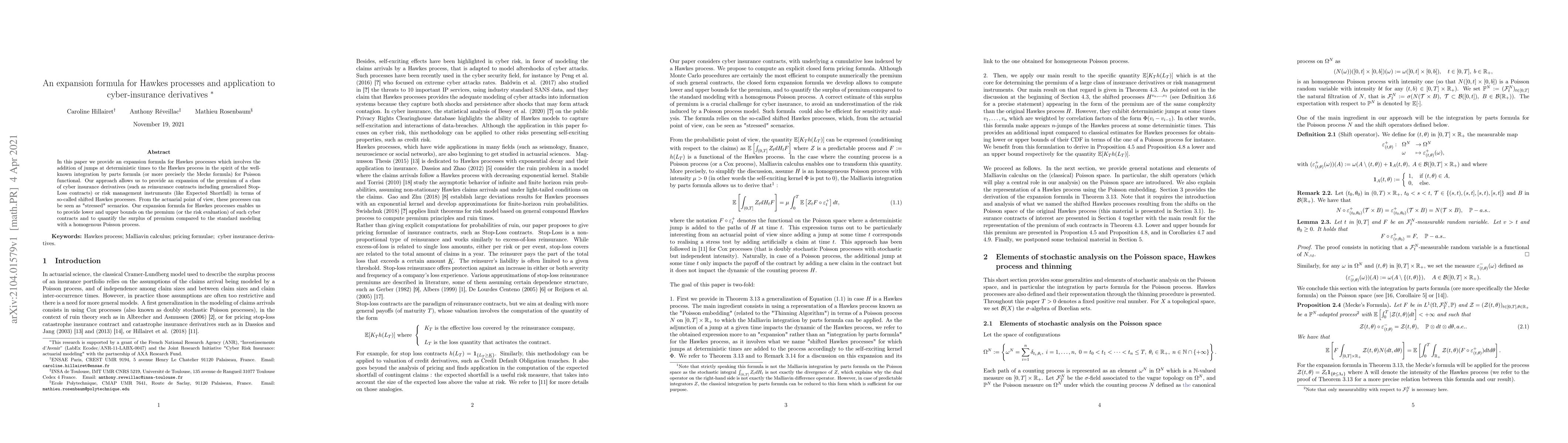 This paper presents an expansion formula for Hawkes processes, incorporating jumps at deterministic times, akin to the Mecke formula for Poisson processes. This formula allows for the creation of lower and upper bounds on the premium of cyber insurance derivatives, like reinsurance contracts and Expected Shortfall, offering a more accurate actuarial assessment than traditional Poisson process models.