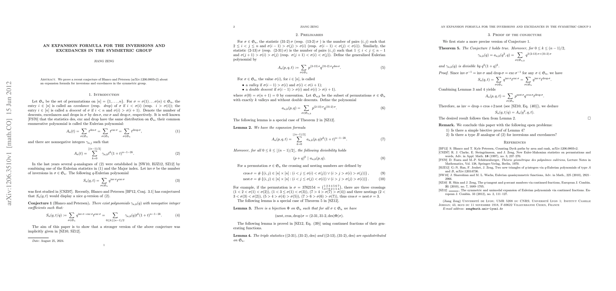 We prove a recent conjecture of Blanco and Petersen (arXiv:1206.0803v2) about an expansion formula for inversions and excedances in the symmetric group.