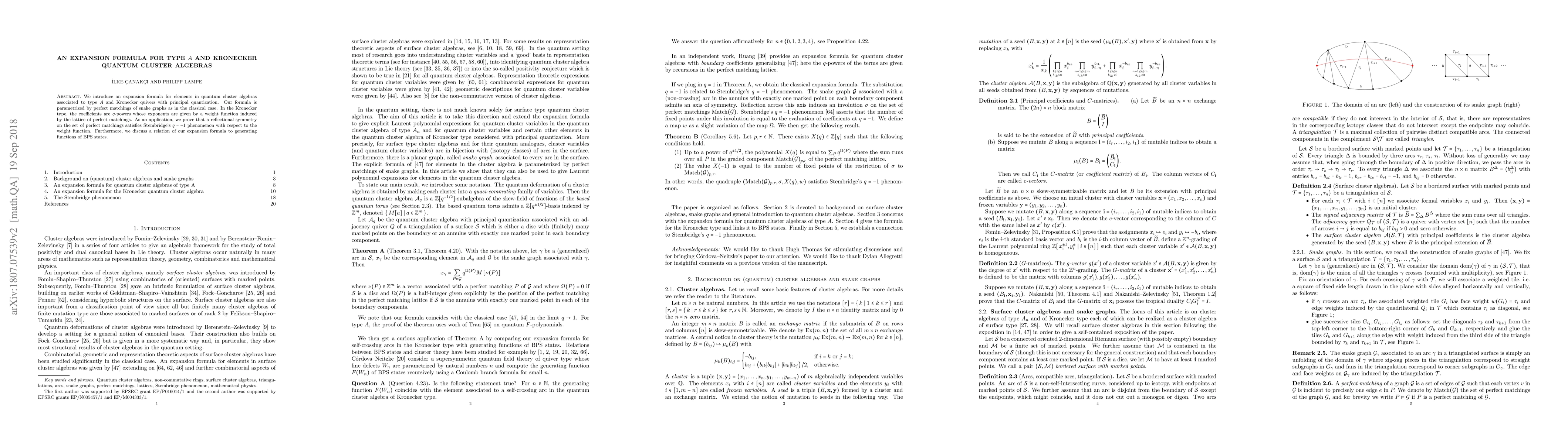 This paper presents an expansion formula for quantum cluster algebras of type A and Kronecker quivers, using perfect matchings of snake graphs. The Kronecker case involves coefficients as q-powers based on a weight function derived from the lattice of perfect matchings, and demonstrates Stembridge's q=-1 phenomenon for reflectional symmetry.