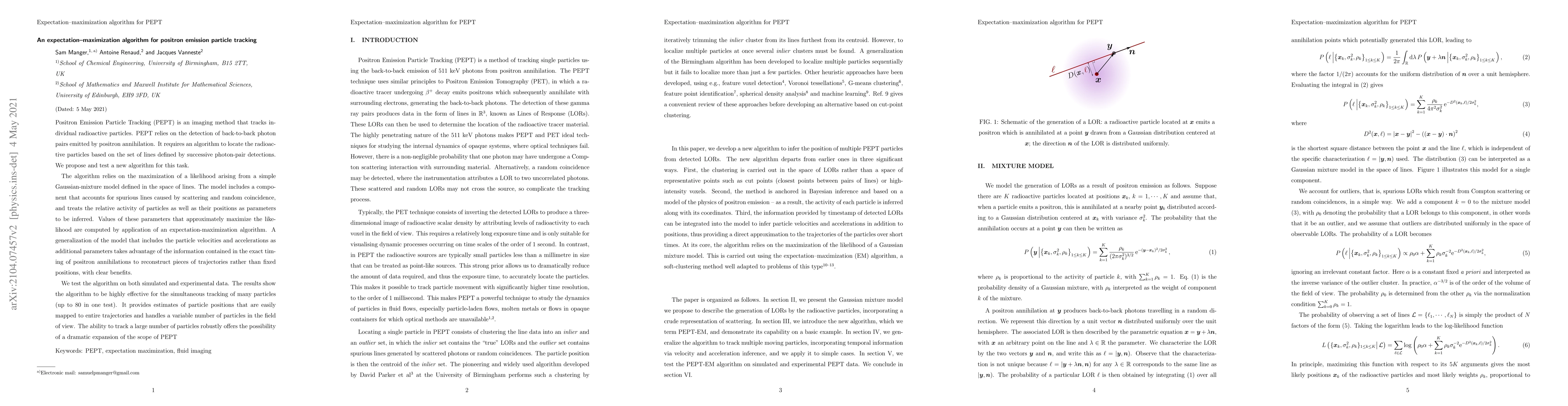This paper proposes an expectation-maximization algorithm for Positron Emission Particle Tracking (PEPT), which uses a Gaussian-mixture model to locate radioactive particles based on photon-pair detections. The algorithm effectively tracks multiple particles and reconstructs trajectories, demonstrating significant potential for expanding PEPT's applications.