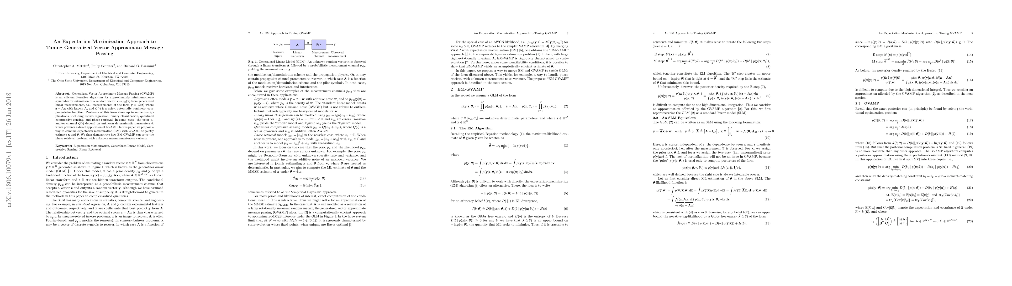 This paper proposes an Expectation-Maximization (EM) approach to tune Generalized Vector Approximate Message Passing (GVAMP) for estimating unknown parameters in complex measurement models. The EM-GVAMP method jointly estimates the signal and unknown parameters, demonstrated effectively in solving the phase retrieval problem.