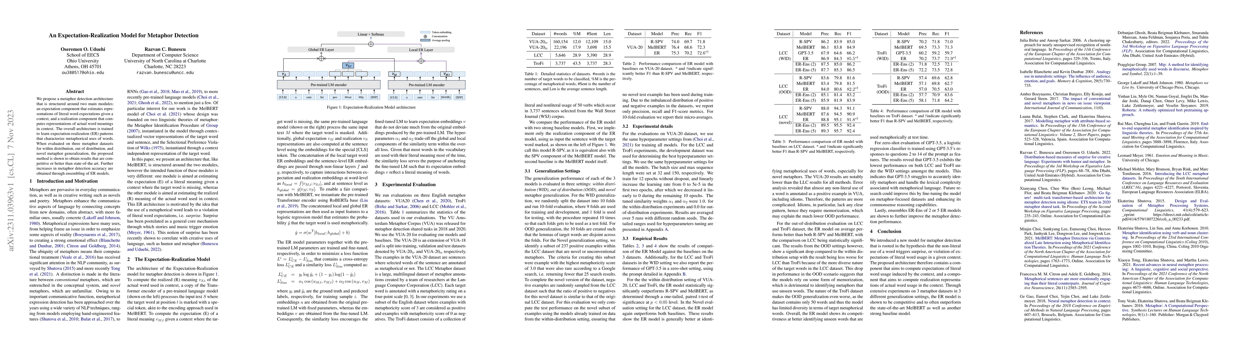 The paper introduces a metaphor detection model with expectation and realization components, achieving competitive results against state-of-the-art methods. Ensembling these models further enhances detection accuracy.