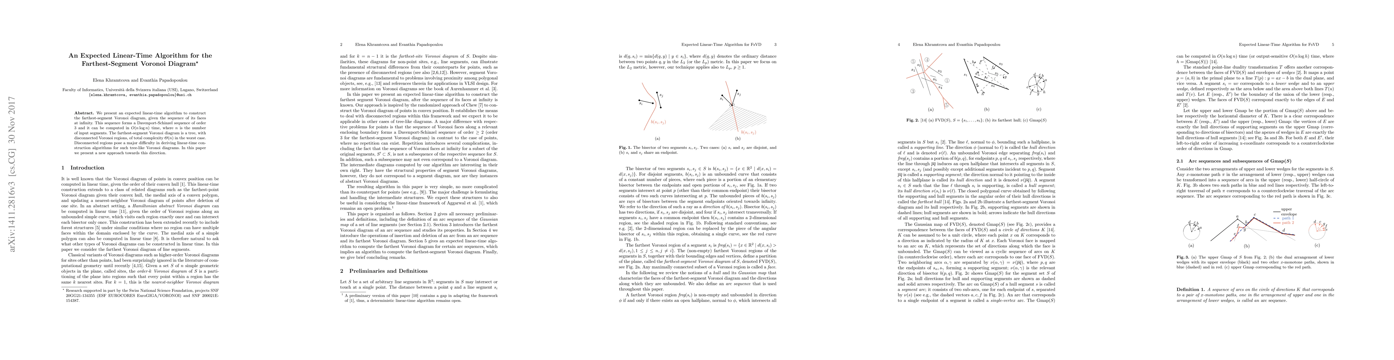 This paper introduces an expected linear-time algorithm for constructing the farthest-segment Voronoi diagram, leveraging the sequence of its faces at infinity, which forms a Davenport-Schinzel sequence of order 3. The algorithm overcomes the challenge of disconnected regions in the tree-like Voronoi diagram.