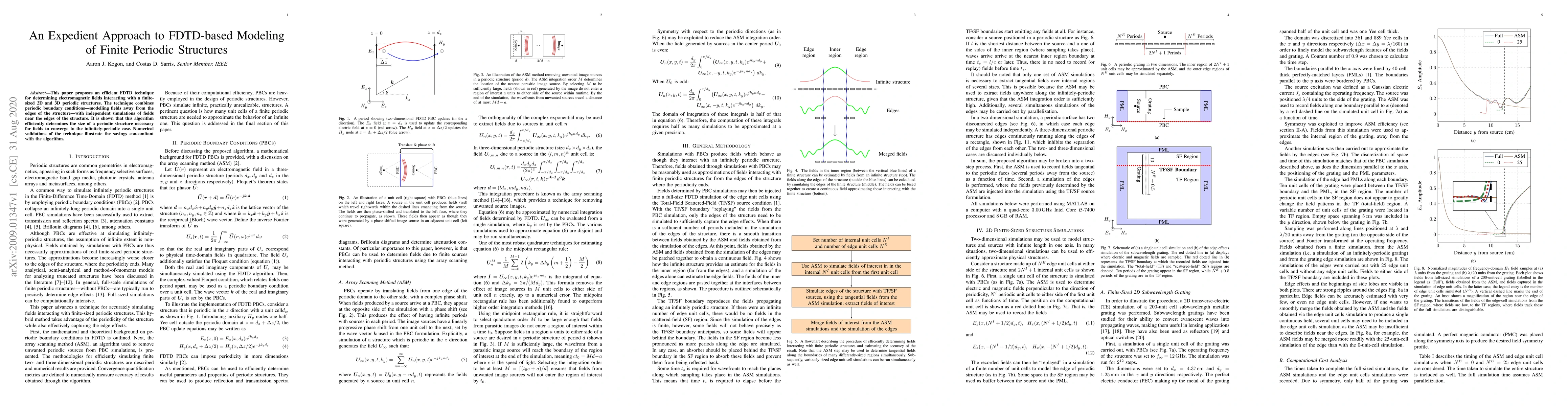 This paper introduces an efficient method to model electromagnetic fields interacting with periodic structures using a finite difference time domain (FDTD) technique, reducing computational costs and enabling convergence to the infinitely-periodic case.