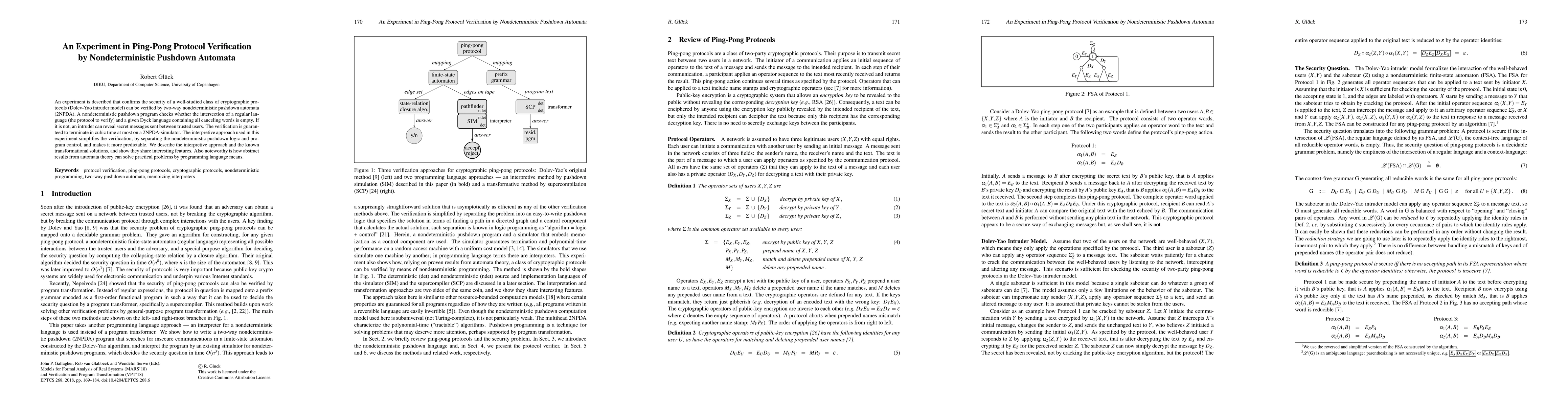 An experiment is described that confirms the security of a well-studied class of cryptographic protocols (Dolev-Yao intruder model) can be verified by two-way nondeterministic pushdown automata (2NPDA). A nondeterministic pushdown program checks whether the intersection of a regular language (the protocol to verify) and a given Dyck language containing all canceling words is empty. If it is not, an intruder can reveal secret messages sent between trusted users. The verification is guaranteed to terminate in cubic time at most on a 2NPDA-simulator. The interpretive approach used in this experiment simplifies the verification, by separating the nondeterministic pushdown logic and program control, and makes it more predictable. We describe the interpretive approach and the known transformational solutions, and show they share interesting features. Also noteworthy is how abstract results from automata theory can solve practical problems by programming language means.