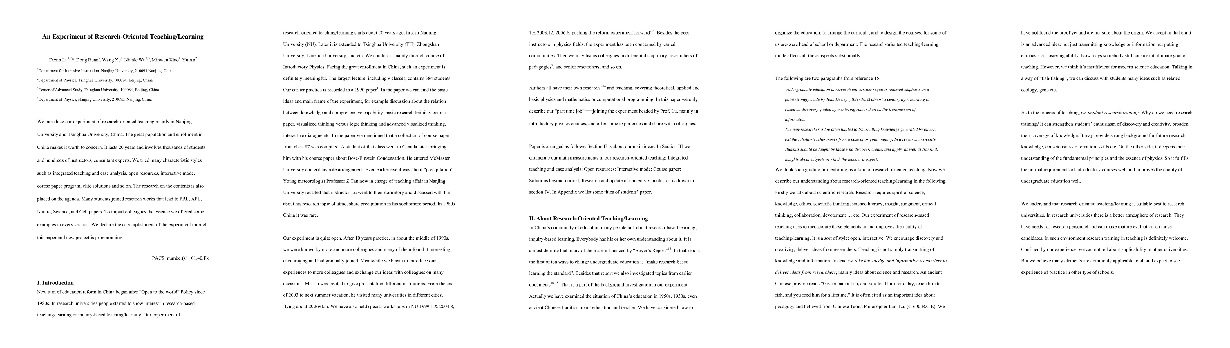 This 20-year experiment in research-oriented teaching at Nanjing University and Tsinghua University involved thousands of students and hundreds of instructors, employing styles like integrated teaching and case analysis. The initiative led to significant research outputs, including publications in prestigious journals, and aims to inspire further educational innovation.