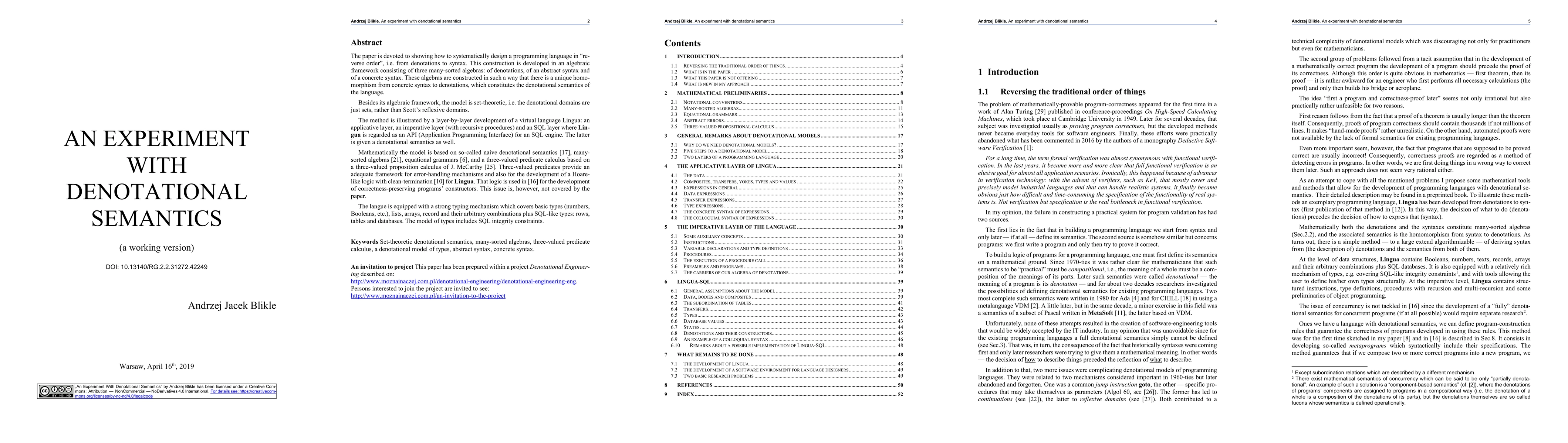 The paper is devoted to showing how to systematically design a programming language in 'reverse order', i.e. from denotations to syntax. This construction is developed in an algebraic framework consisting of three many-sorted algebras: of denotations, of an abstract syntax and of a concrete syntax. These algebras are constructed in such a way that there is a unique homomorphism from concrete syntax to denotations, which constitutes the denotational semantics of the language. Besides its algebraic framework, the model is set-theoretic, i.e. the denotational domains are just sets, rather than Scott's reflexive domains. The method is illustrated by a layer-by-layer development of a virtual language Lingua: an applicative layer, an imperative layer (with recursive procedures) and an SQL layer where Lingua is regarded as an API (Application Programming Interface) for an SQL engine. The latter is given a denotational semantics as well. The langue is equipped with a strong typing mechanism which covers basic types (numbers, Booleans, etc.), lists, arrays, record and their arbitrary combinations plus SQL-like types: rows, tables and databases. The model of types includes SQL integrity constraints.