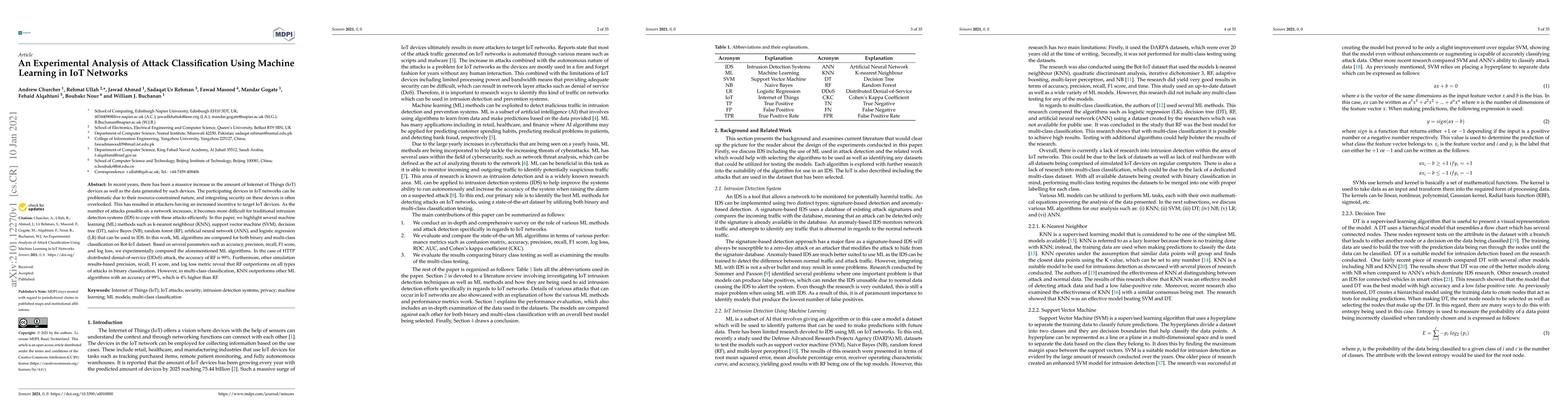 This paper explores various machine learning methods for classifying attacks in IoT networks, comparing algorithms like k-nearest neighbour, SVM, DT, NB, RF, ANN, and LR using the Bot-IoT dataset. The results show that random forest excels in HTTP DDoS attack detection with 99% accuracy, while k-nearest neighbour outperforms in multi-class classification.