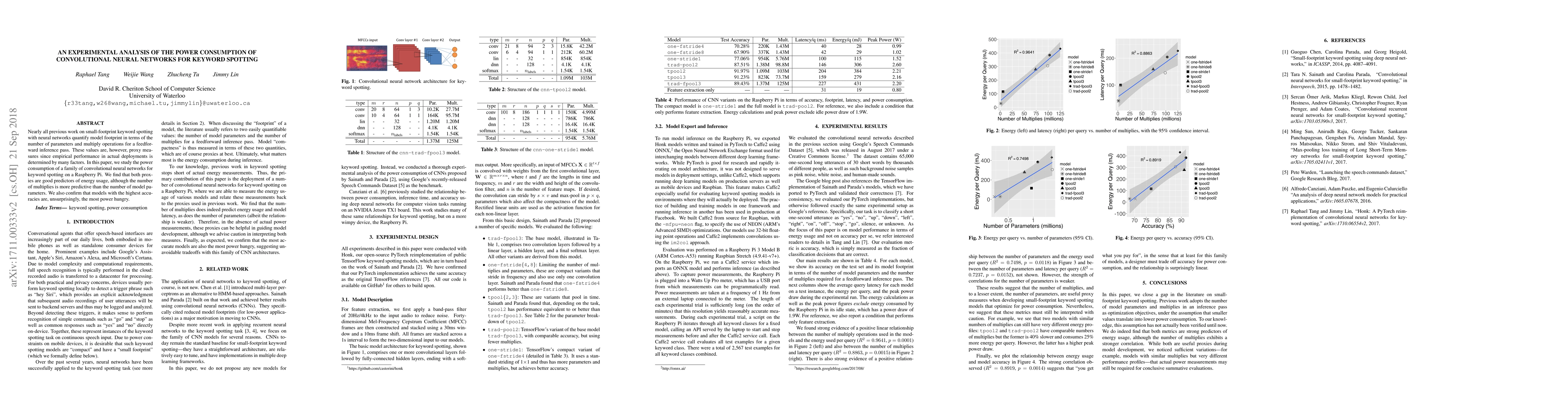 This paper investigates the power consumption of convolutional neural networks for keyword spotting on a Raspberry Pi, finding that while both model parameters and multiplies predict energy usage, multiplies are a more accurate predictor. It concludes that higher accuracy models consume more power.