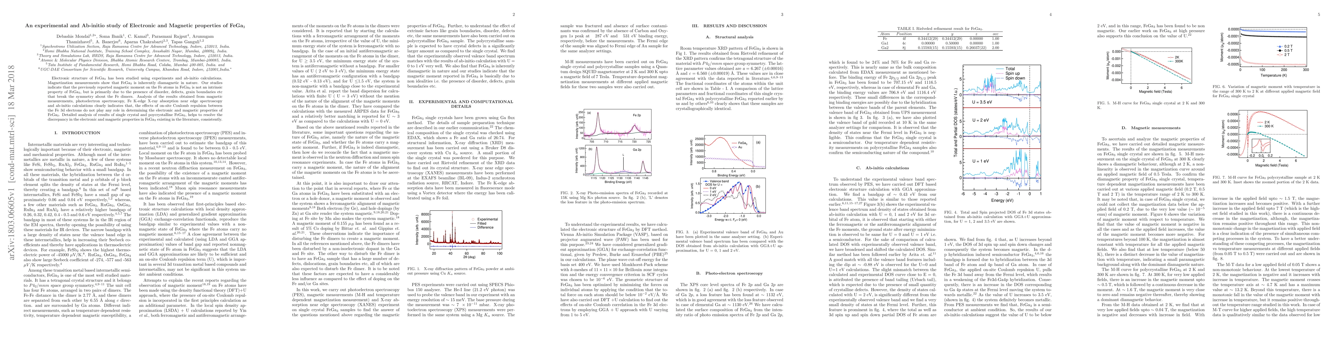 Electronic structure of FeGa3 has been studied using experiments and ab-initio calculations. Magnetization measurements show that FeGa3 is inherently diamagnetic in nature. Our studies indicate that the previously reported magnetic moment on the Fe atoms in FeGa3 is not an intrinsic property of FeGa3, but is primarily due to the presence of disorder, defects, grain boundaries etc that break the symmetry about the Fe dimers. Analysis of the results obtained from magnetic measurements, photoelectron spectroscopy, Fe K-edge X-ray absorption near edge spectroscopy and ab-initio calculations clearly indicates that, the effects of on-site Coulomb repulsion between the Fe 3d electrons do not play any role in determining the electronic and magnetic properties of FeGa3. Detailed analysis of results of single crystal and poycrystalline FeGa3, helps to resolve the discrepancy in the electronic and magnetic properties in FeGa3 existing in the literature, consistently.