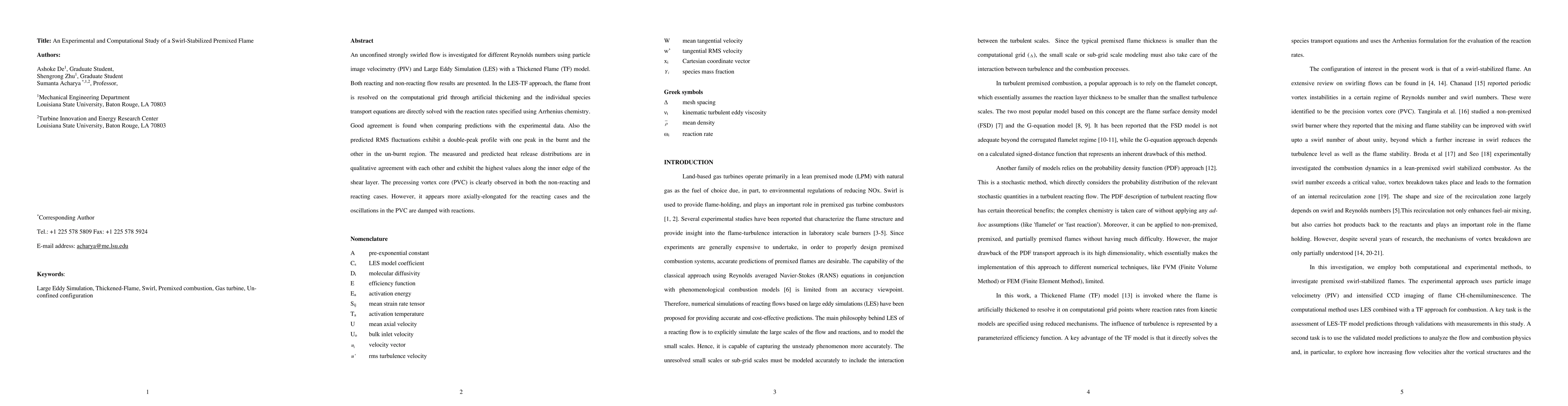 This study combines experimental and computational methods to investigate a swirl-stabilized premixed flame, showing good agreement between Large Eddy Simulation predictions and PIV measurements, with notable double-peak RMS fluctuations and a precessing vortex core observed in both reacting and non-reacting flows.