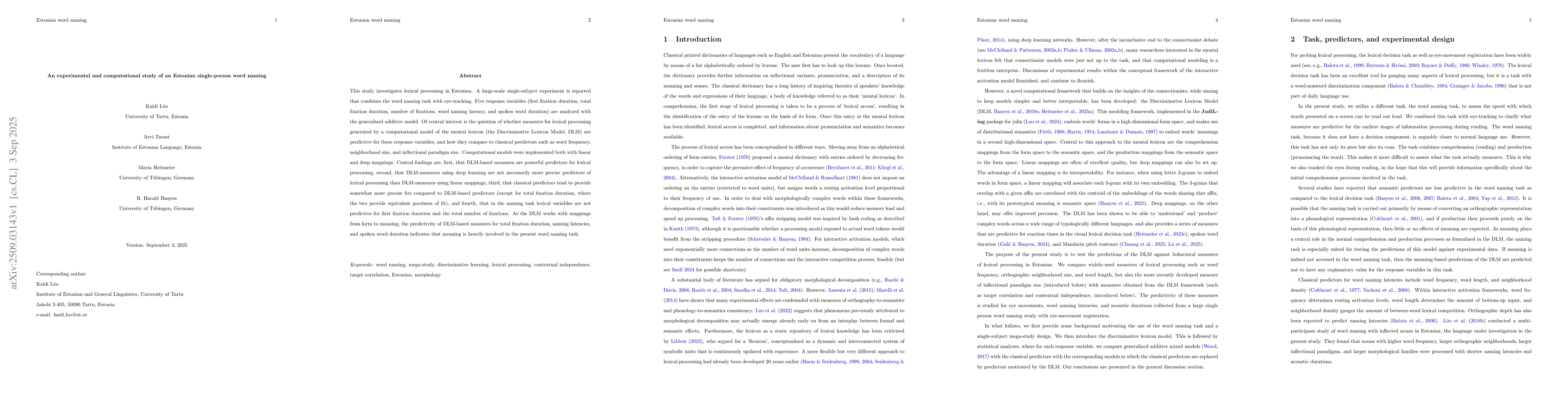 This study investigates lexical processing in Estonian. A large-scale single-subject experiment is reported that combines the word naming task with eye-tracking. Five response variables (first fixation duration, total fixation duration, number of fixations, word naming latency, and spoken word duration) are analyzed with the generalized additive model. Of central interest is the question of whether measures for lexical processing generated by a computational model of the mental lexicon (the Discriminative Lexicon Model, DLM) are predictive for these response variables, and how they compare to classical predictors such as word frequency, neighborhood size, and inflectional paradigm size. Computational models were implemented both with linear and deep mappings. Central findings are, first, that DLM-based measures are powerful predictors for lexical processing, second, that DLM-measures using deep learning are not necessarily more precise predictors of lexical processing than DLM-measures using linear mappings, third, that classical predictors tend to provide somewhat more precise fits compared to DLM-based predictors (except for total fixation duration, where the two provide equivalent goodness of fit), and fourth, that in the naming task lexical variables are not predictive for first fixation duration and the total number of fixations. As the DLM works with mappings from form to meaning, the predictivity of DLM-based measures for total fixation duration, naming latencies, and spoken word duration indicates that meaning is heavily involved in the present word naming task.