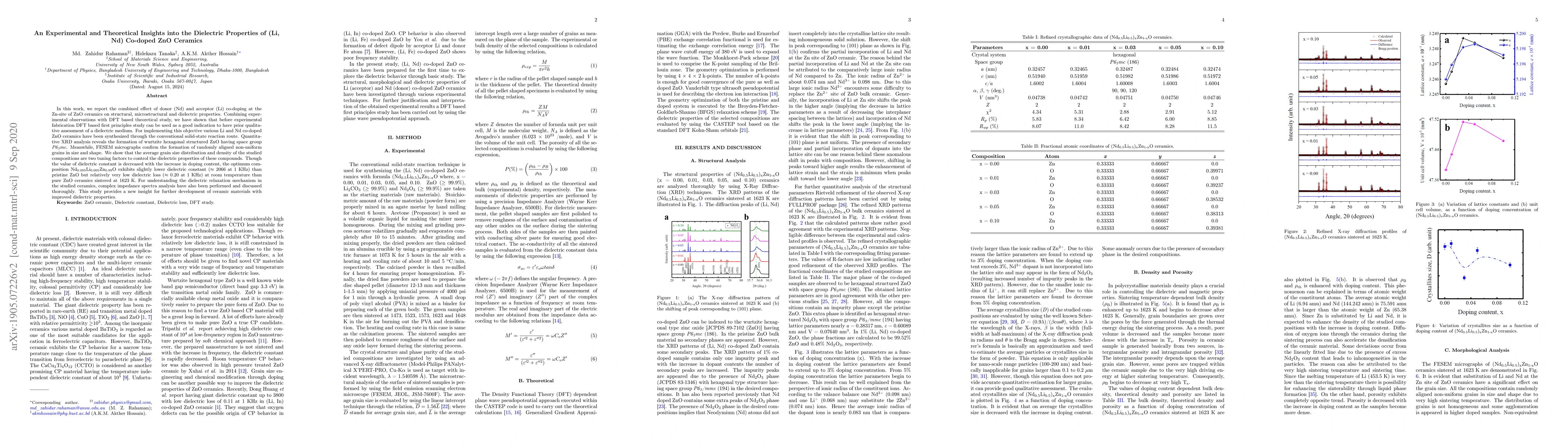In this work, we report the combined effect of donor (Nd) and acceptor (Li) co-doping at the Zn-site of ZnO ceramics on structural, microstructural and dielectric properties. Combining experimental observations with DFT based theoretical study, we have shown that before experimental fabrication DFT based first principles study can be used as a good indication to have prior qualitative assessment of a dielectric medium. For implementing this objective various Li and Nd co-doped ZnO ceramics have been synthesized through the conventional solid-state reaction route. Quantitative XRD analysis reveals the formation of wurtzite hexagonal structured ZnO having space group P63mc. Meanwhile, FESEM micrographs confirm the formation of randomly aligned non-uniform grains in size and shape. We show that the average grain size distribution and density of the studied compositions are two tuning factors to control the dielectric properties of these compounds. Though the value of dielectric constant is decreased with the increase in doping content, the optimum composition Nd0.005Li0.005Zn0.99O exhibits slightly lower dielectric constant (2066 at 1 KHz) than pristine ZnO but relatively very low dielectric loss (0.20 at 1 KHz) at room temperature than pure ZnO ceramics sintered at 1623 K. For understanding the dielectric relaxation mechanism in the studied ceramics, complex impedance spectra analysis have also been performed and discussed thoroughly. This study provides a new insight for further development of colossal permittivity (CP) ceramics and extends the current understanding of CP mechanism in ceramic materials.