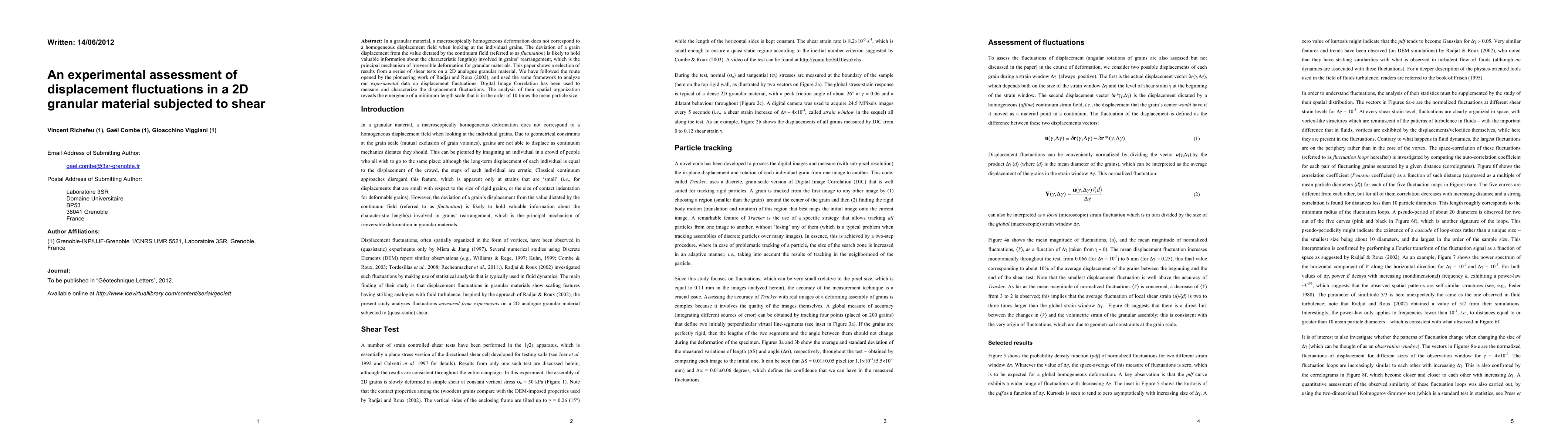 In a granular material, a macroscopically homogeneous deformation does not correspond to a homogeneous displacement field when looking at the individual grains. The deviation of a grain displacement from the value dictated by the continuum field (referred to as fluctuation) is likely to hold valuable information about the characteristic length(s) involved in grains' rearrangement, which is the principal mechanism of irreversible deformation for granular materials. This paper shows a selection of results from a series of shear tests on a 2D analogue granular material. We have followed the route opened by the pioneering work of Radja\"i and Roux (2002), and used the same framework to analyze our experimental data on displacement fluctuations. Digital Image Correlation has been used to measure and characterize the displacement fluctuations. The analysis of their spatial organization reveals the emergence of a minimum length scale that is in the order of 10 times the mean particle size.