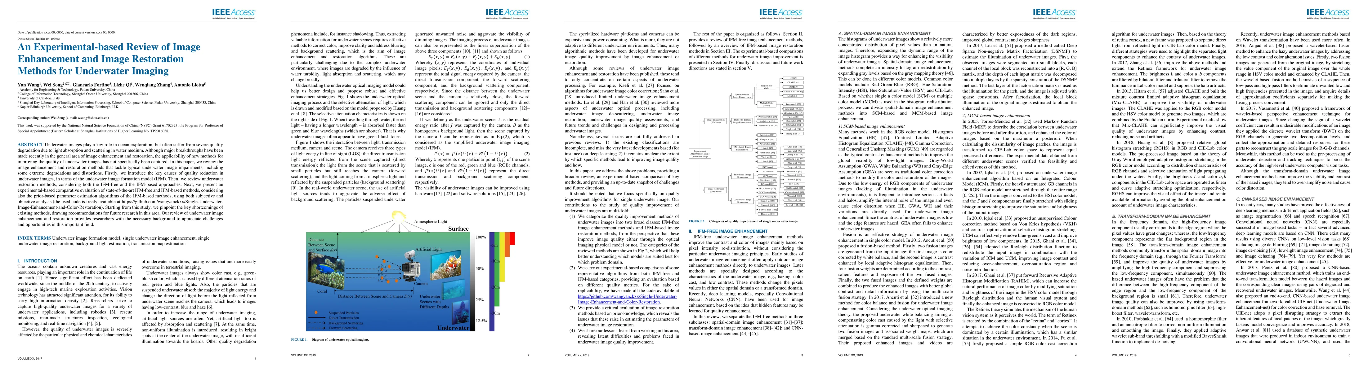 This paper reviews image enhancement and restoration techniques for underwater imaging, analyzing both IFM-free and IFM-based methods through experimental comparisons. It identifies key challenges and recommends future research directions to improve the quality of underwater images.