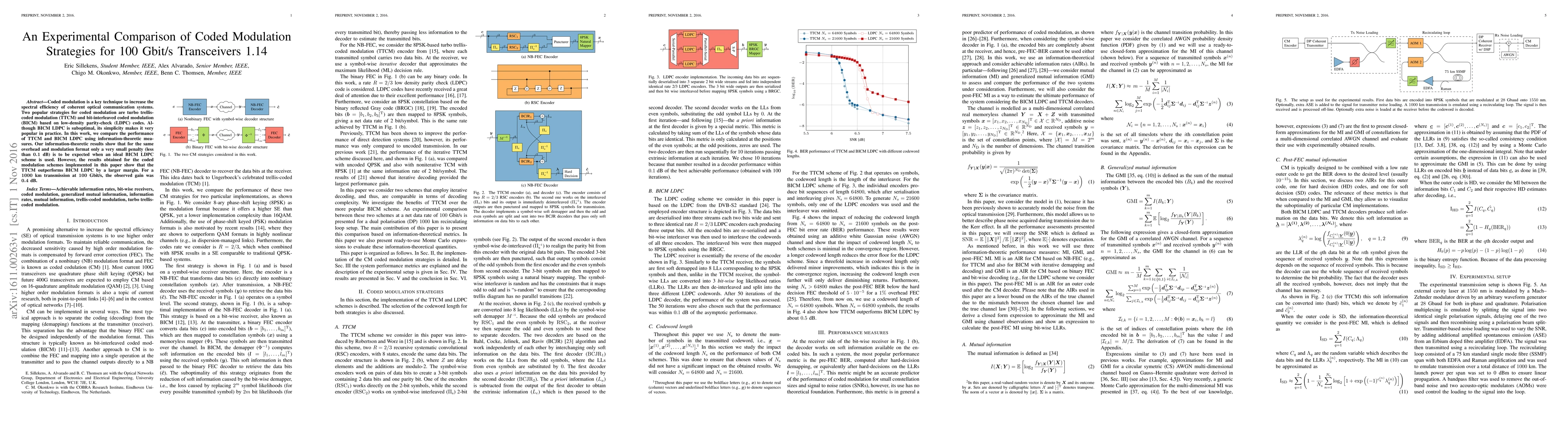 This study experimentally compares turbo trellis-coded modulation (TTCM) and bit-interleaved coded modulation (BICM) with low-density parity-check (LDPC) codes for 100 Gbit/s optical communication. Information-theoretic analysis indicates a small performance difference (less than 0.1 dB) between ideal BICM LDPC and TTCM. However, practical implementations show TTCM outperforming BICM LDPC, achieving a 0.4 dB gain for 1000 km transmission at 100 Gbit/s.