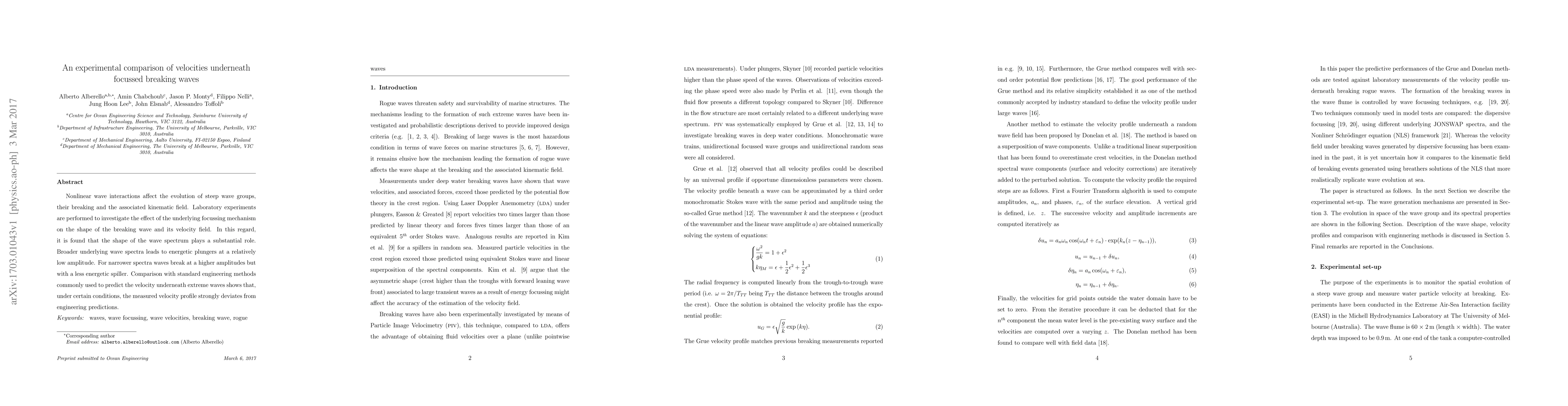 Nonlinear wave interactions affect the evolution of steep wave groups, their breaking and the associated kinematic field. Laboratory experiments are performed to investigate the effect of the underlying focussing mechanism on the shape of the breaking wave and its velocity field. In this regard, it is found that the shape of the wave spectrum plays a substantial role. Broader underlying wave spectra leads to energetic plungers at a relatively low amplitude. For narrower spectra waves break at a higher amplitudes but with a less energetic spiller. Comparison with standard engineering methods commonly used to predict the velocity underneath extreme waves shows that, under certain conditions, the measured velocity profile strongly deviates from engineering predictions.