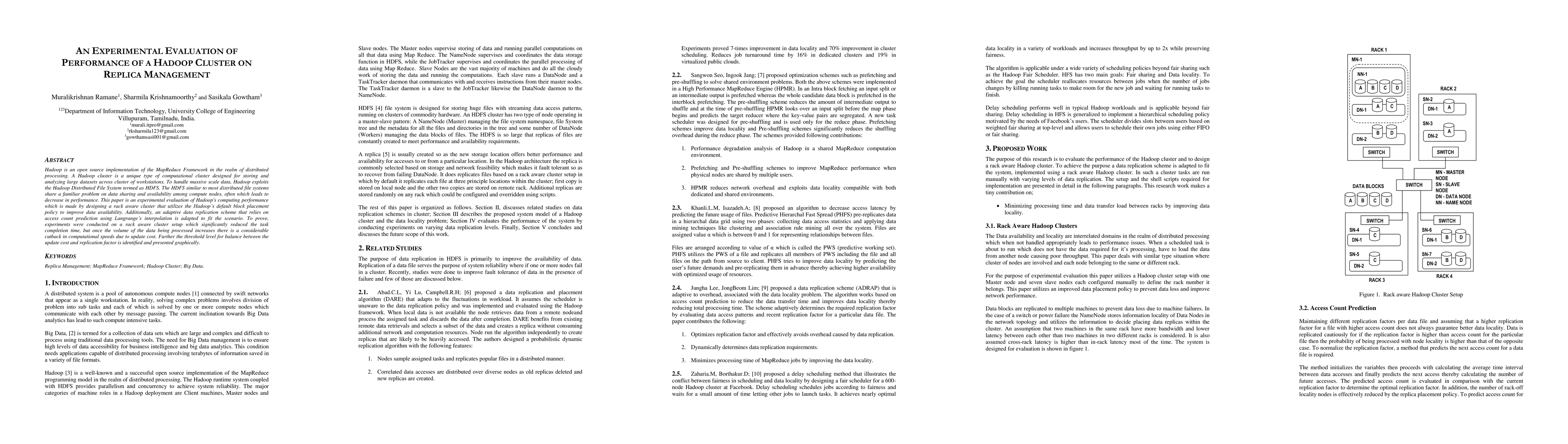 This paper evaluates Hadoop cluster performance on replica management using a rack-aware setup and adaptive replication based on access count prediction. Experiments show reduced task completion time but diminishing returns as data volume increases due to update costs.