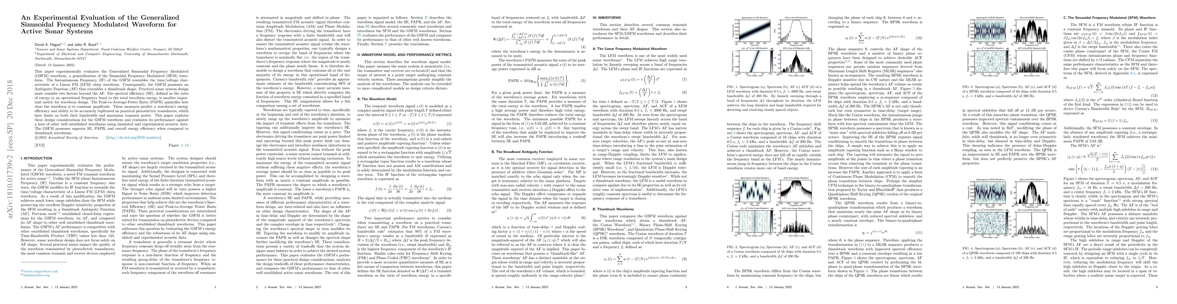 This paper experimentally evaluates the Generalized Sinusoidal Frequency Modulated (GSFM) waveform, a generalization of the Sinusoidal Frequency Modulated (SFM) waveform. The Instantaneous Frequency (IF) of the GSFM resembles the time/voltage characteristic of a Linear FM (LFM) chirp waveform. Consequently, the GSFM possesses an Ambiguity Function (AF) that resembles a thumbtack shape. Practical sonar system design must consider two factors beyond the AF. The spectral efficiency (SE), defined as the ratio of energy in an operational frequency band to the total waveform energy, is another important metric for waveform design. The Peak-to-Average-Power Ratio (PAPR) quantifies how close the waveform is to constant amplitude. These measures predict a waveform's energy efficiency and ability to be accurately replicated on practical piezoelectric transducers, which have limits on both their bandwidth and maximum transmit power. This paper explores these design considerations for the GSFM waveform and evaluates its performance against a host of other well established waveforms using simulated and experimental acoustic data. The GSFM possesses superior SE, PAPR, and overall energy efficiency when compared to thumbtack waveforms.