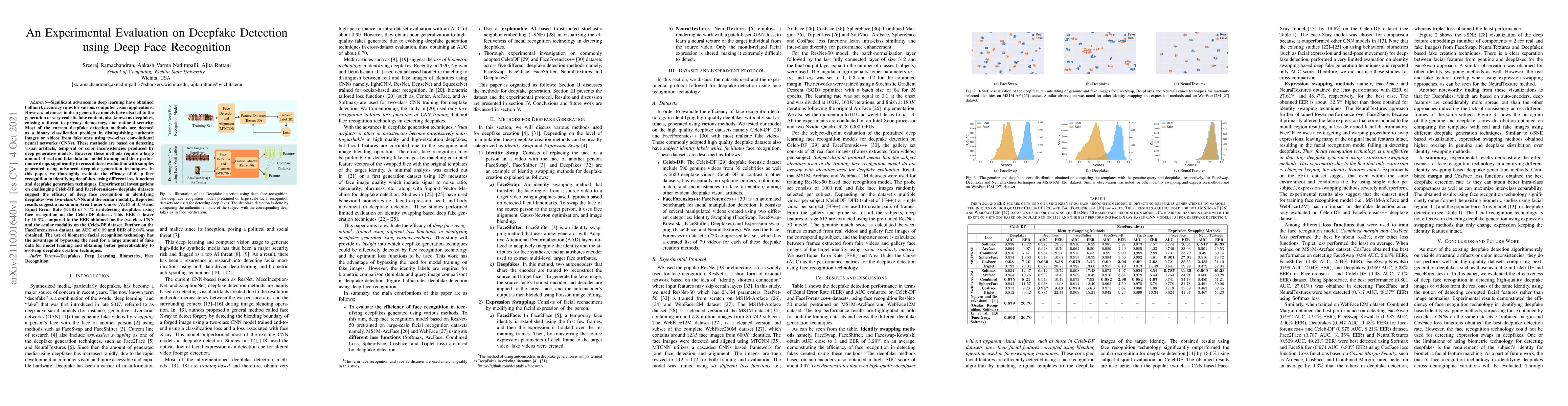 This paper evaluates deep face recognition for detecting deepfakes, achieving superior results compared to traditional two-class CNNs and the ocular modality. It reports high performance metrics, including an EER of 7.1% on Celeb-DF and 2.04% on FaceForensics++, demonstrating better generalizability and reduced reliance on large fake datasets.
