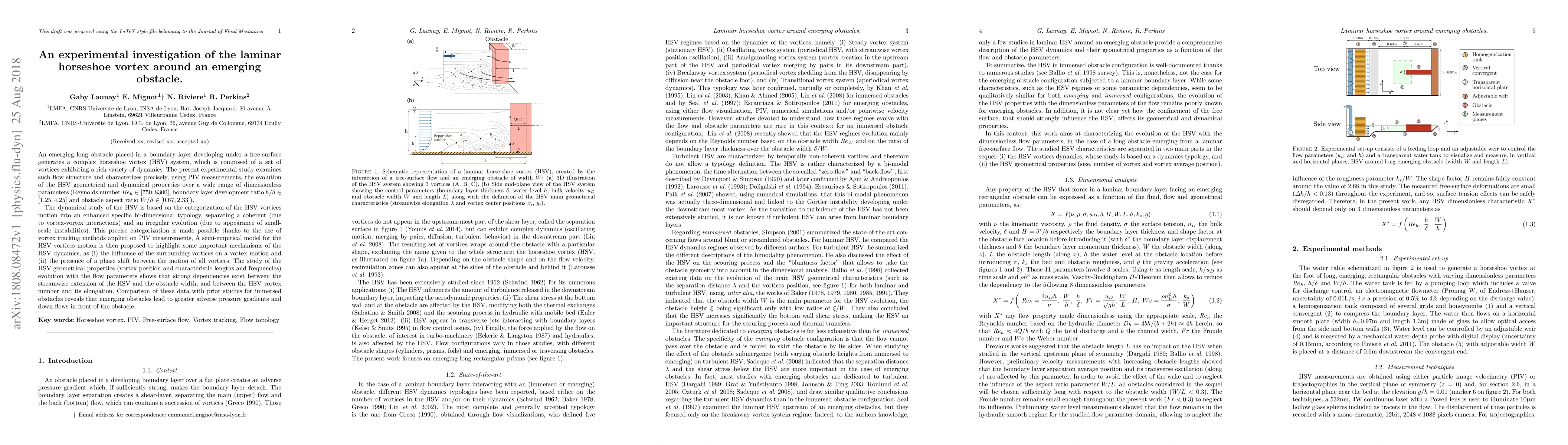 This paper investigates the dynamics of a laminar horseshoe vortex system around an emerging obstacle using PIV measurements, categorizing vortex motion into coherent and irregular types. A semi-empirical model highlights interactions and phase shifts among vortices, revealing strong dependencies between vortex geometry and flow parameters, and showing that emerging obstacles induce greater adverse pressure gradients compared to immersed obstacles.