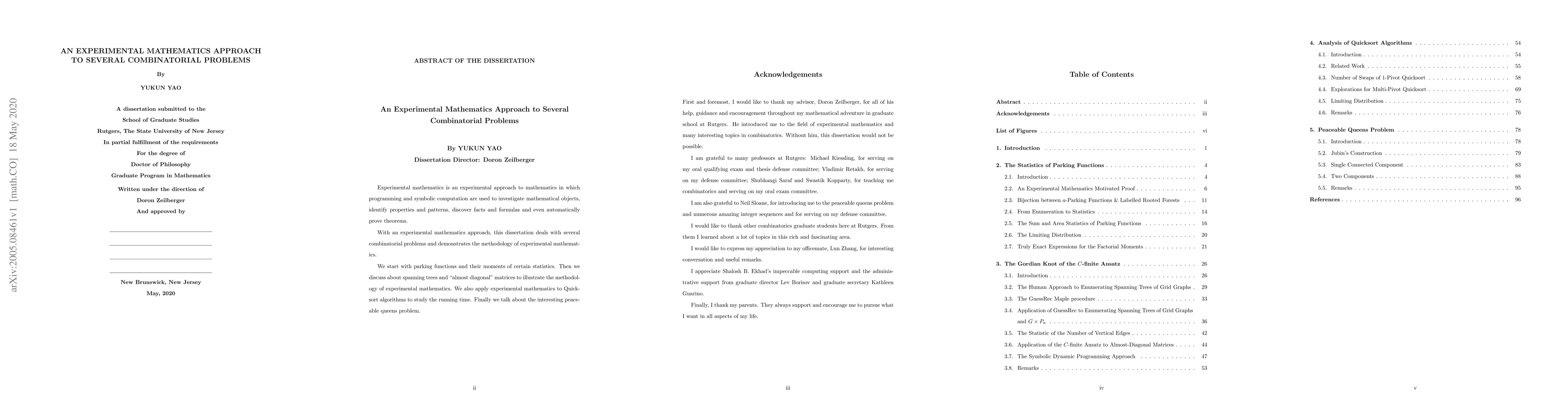 This paper employs experimental mathematics to explore various combinatorial problems, including parking functions, spanning trees, "almost diagonal" matrices, Quicksort algorithms, and the peaceable queens problem, demonstrating the methodology and potential of computational approaches in mathematical discovery.