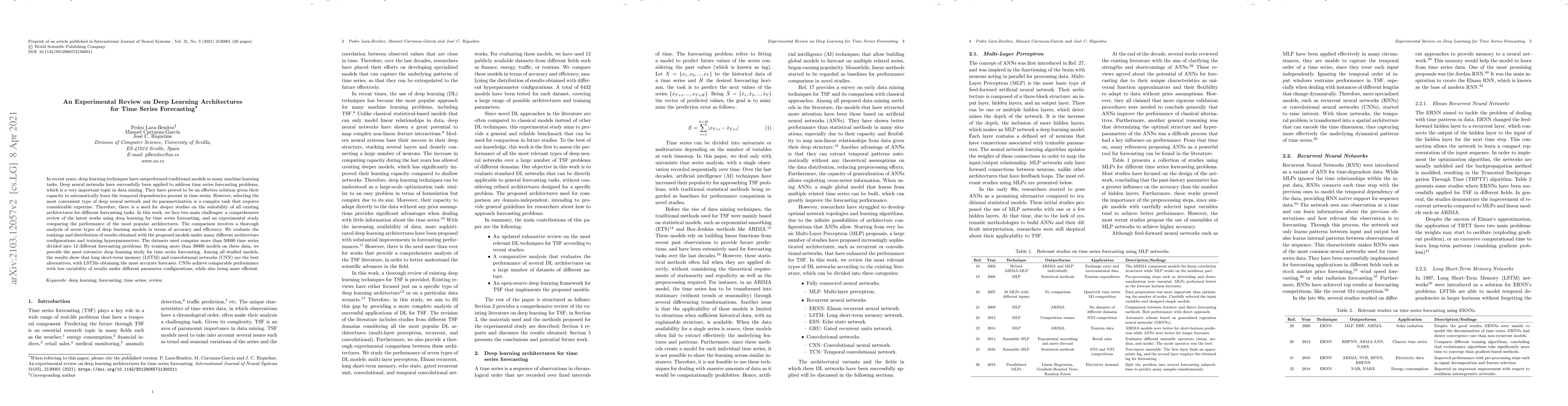This paper conducts a comprehensive review and experimental study on deep learning architectures for time series forecasting. The study evaluates seven popular deep learning models, including LSTM and CNN, across numerous configurations and hyperparameters using over 50,000 time series data points. The results indicate that LSTMs provide the most accurate forecasts, while CNNs offer comparable performance with less variability and greater efficiency.