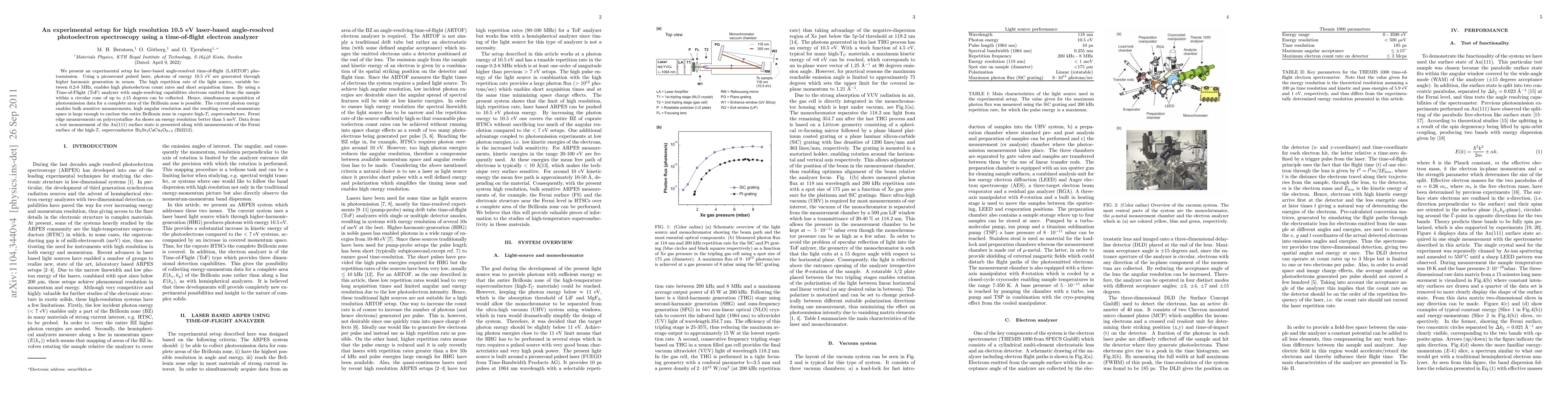 This paper details an experimental setup for high-resolution laser-based angle-resolved photoelectron spectroscopy using a time-of-flight electron analyzer, employing a picosecond pulsed laser for 10.5 eV photons and enabling high photoelectron count rates and short acquisition times. The setup allows for complete Brillouin zone measurements in cuprate superconductors, demonstrated through Fermi edge measurements on Au and surface state analysis on Au(111).