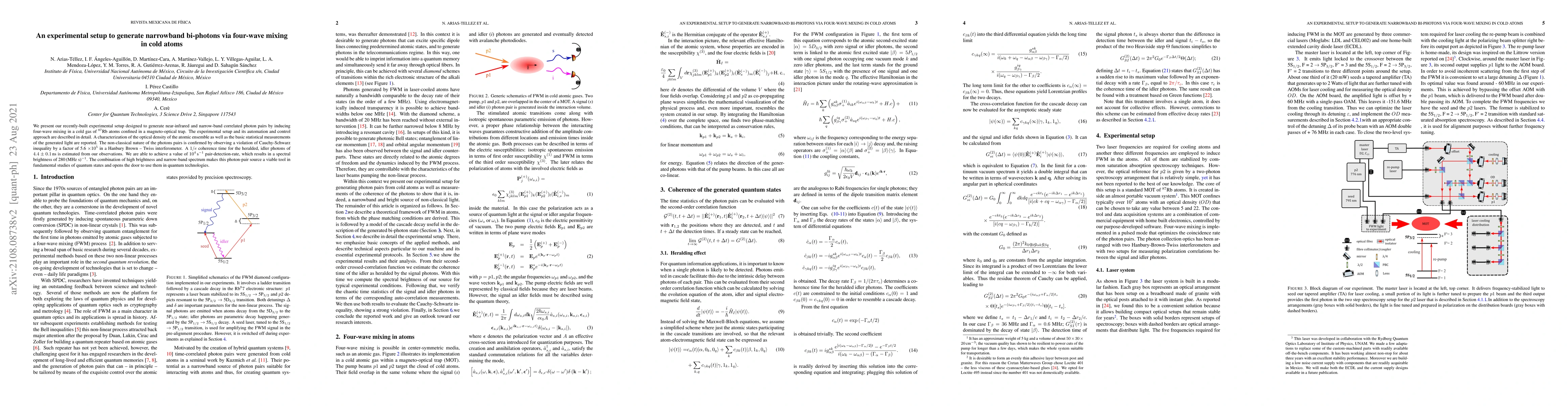 This paper details an experimental setup for generating narrowband bi-photons via four-wave mixing in cold $^{87}$Rb atoms, demonstrating high spectral brightness and coherence. The setup achieves a pair-detection rate of $10^{4}$ s$^{-1}$, confirming the non-classical nature of the photon pairs through a significant violation of the Cauchy-Schwarz inequality.